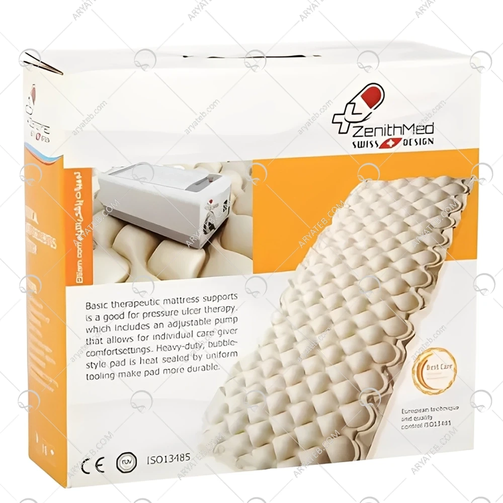 تشک مواج سلولی ECO زنیت مد به لحاظ ظاهری، از یک سیستم دو قسمتی مجزا تشکیل شده است. بخش تشک (Mattress) دارای یک لایه زیرین ثابت و ردیفهای موازی از سلولهای لولهای شکل است که به صورت عرضی روی تشک قرار گرفتهاند. این سلولها به طور عمودی باد میشوند و به صورت یک ستون مرتفع از هوا، بدن بیمار را حمایت میکنند. این مدلها اغلب با روکشهای محافظتی (Cover Sheet) عرضه میشوند که معمولاً از جنس نایلون یا پلیاورتان (Polyurethane - PU) مقاوم در برابر آب و قابل تنفس ساخته شدهاند. جنس خود سلولها و بدنه تشک اغلب از پی وی سی (PVC) پزشکی سنگین یا مخلوطی از PVC و نایلون است تا در برابر پارگی و سایش مقاومت بالایی داشته باشد. بخش دوم، واحد پمپ است که یک جعبه پلاستیکی مستطیلی کوچک بوده و دارای یک صفحه کنترل ساده شامل دکمه روشن/خاموش و یک دکمه چرخشی (Dial) برای تنظیم فشار بر اساس وزن بیمار میباشد. شلنگهای اتصال که تشک را به پمپ متصل میکنند، از جنس لاستیک انعطافپذیر ساخته شدهاند و به صورت یک مجموعه شلنگ واحد (Single Connector) به پمپ وصل میشوند تا فرآیند اتصال ساده باشد. رنگ تشکها معمولاً خنثی (مانند آبی یا خاکستری) است.