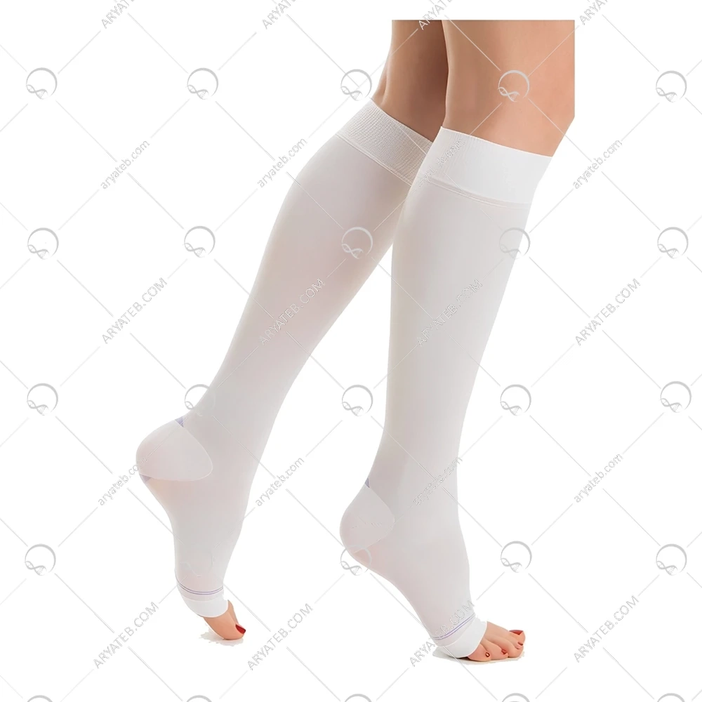 ویژگیهای ظاهری جوراب آنتی آمبولی زیر زانو به گونهای طراحی شدهاند که علاوه بر کاربرد درمانی، امکان نظارت بالینی و راحتی بیمار را نیز فراهم کنند. این جورابها معمولاً به رنگ سفید یا بژ تولید میشوند. این انتخاب رنگ خنثی و روشن، تصادفی نیست؛ بلکه به کادر درمانی اجازه میدهد تا هرگونه خونریزی، ترشح یا آلودگی را به سرعت تشخیص دهند. یکی از مشخصههای بارز بسیاری از این جورابها، وجود یک سوراخ بازرسی (Inspection Hole) در قسمت زیرین یا رویی انگشتان پا است. این سوراخ به پرستاران و پزشکان اجازه میدهد تا بدون نیاز به درآوردن کامل جوراب، به سرعت و به راحتی وضعیت گردش خون محیطی را ارزیابی کنند. آنها میتوانند رنگ بستر ناخن، دمای پوست و زمان پر شدن مجدد مویرگی (Capillary Refill Time) را بررسی کنند که همگی شاخصهای مهمی از کفایت جریان خون شریانی هستند. این جورابها به دو صورت پنجهباز (Open-Toe) و پنجهبسته (Closed-Toe) موجود هستند، که مدل پنجهباز به دلیل وجود همان سوراخ بازرسی، در محیطهای بیمارستانی رایجتر است. بافت پارچه معمولاً صاف و یکنواخت است، اما در نگاه دقیقتر، میتوان دید که بافت در قسمتهای مختلف کمی متفاوت است تا فشار تدریجی را اعمال کند. پاشنه مشخص و تقویتشده (Defined Heel Pocket) یکی دیگر از ویژگیهای طراحی است. این قسمت به قرارگیری صحیح جوراب روی پا کمک کرده و از چرخش آن جلوگیری میکند و تضمین مینماید که ناحیه حداکثر فشار دقیقاً روی مچ پا قرار گیرد. لبه بالایی جوراب نرم و غیرفشرده طراحی شده تا از ایجاد اثر "تورنیکه" یا بند آمدن جریان خون در زیر زانو جلوگیری کند. همانطور که پیشتر اشاره شد، این لبه اغلب مجهز به یک نوار سیلیکونی داخلی است که جوراب را در جای خود ثابت نگه میدارد. به طور کلی، ظاهر این جورابها ساده، کاربردی و کاملاً متمرکز بر اهداف پزشکی است و هر جزء از طراحی آن، دلیلی عملکردی در پس خود دارد.