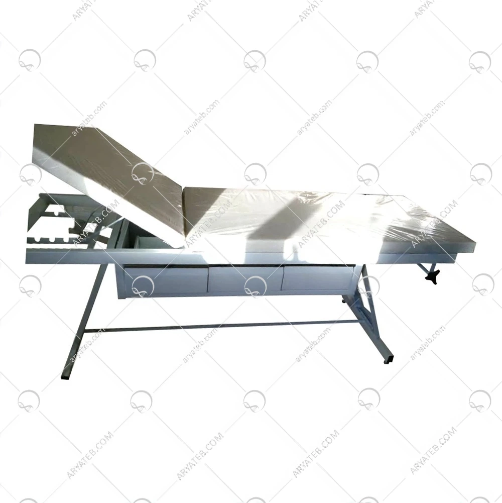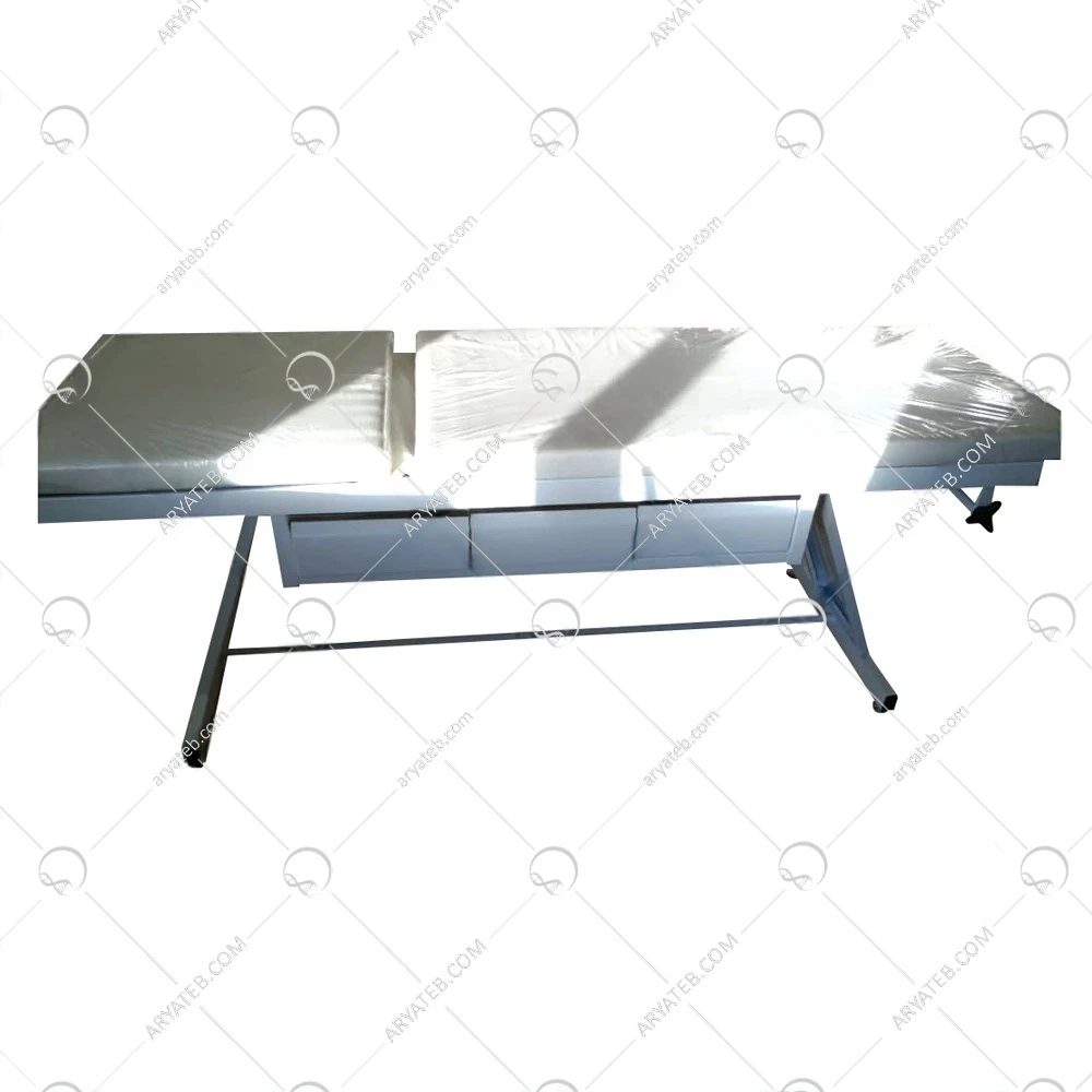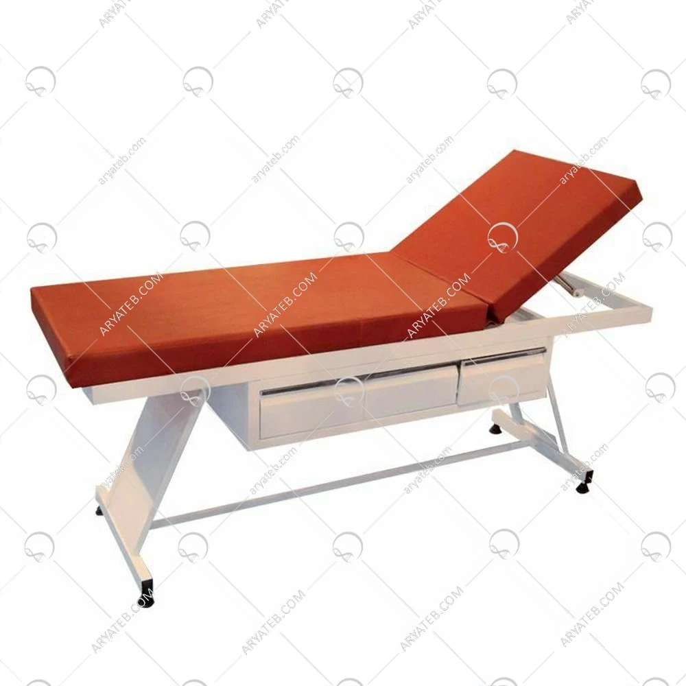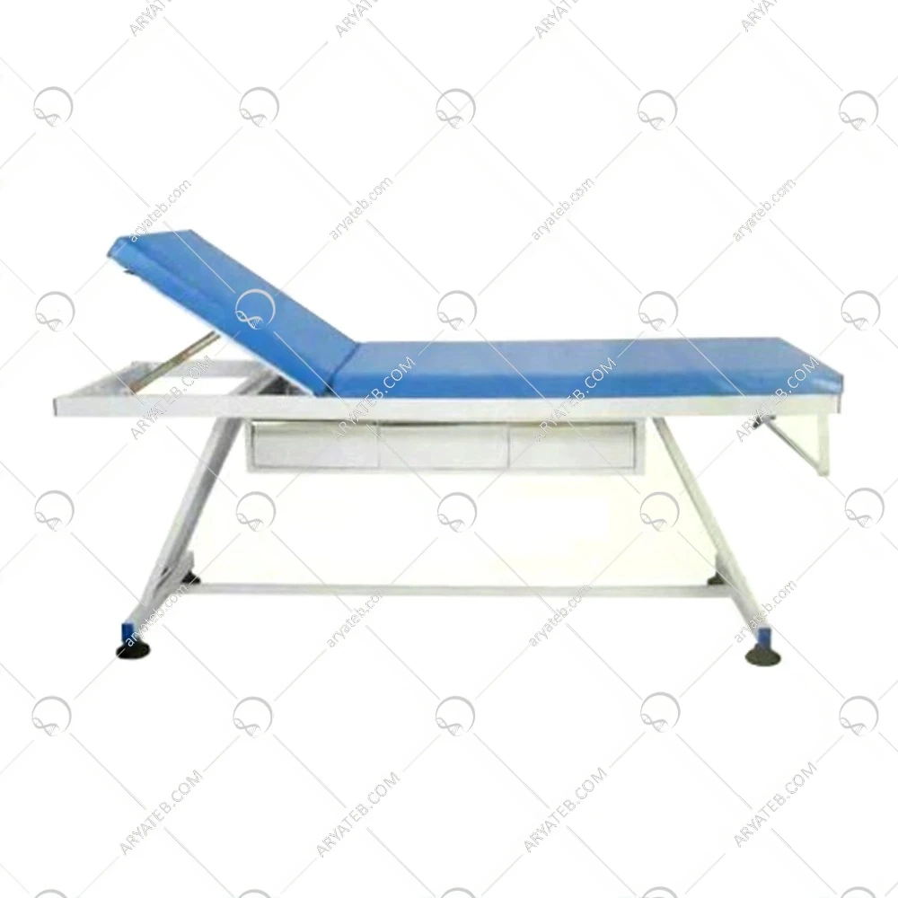 سطح بستر تخت معاینه پایه کج کشو دار، دارای یک شکن می باشد.