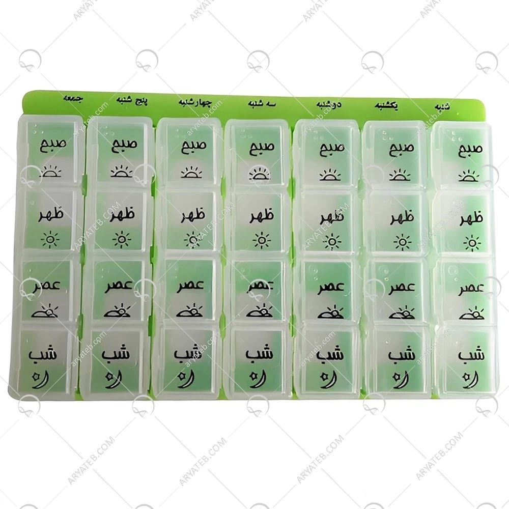 - به عنوان مثال بر روی هر قسمت از تقویم دارویی هفتگی، نام روز های هفته ثبت شده است. و بر روی طبقات تقویم دارویی روزانه، وعده ها و زمان مصرف قرص در طول یک روز تعیین شده است. این وعده ها می تواند شامل وعده های صبح، ظهر، عصر و شب باشد. به این صورت افراد می توانند دارو های هر روز را جداگانه در قسمت مربوطه قرار دهند .