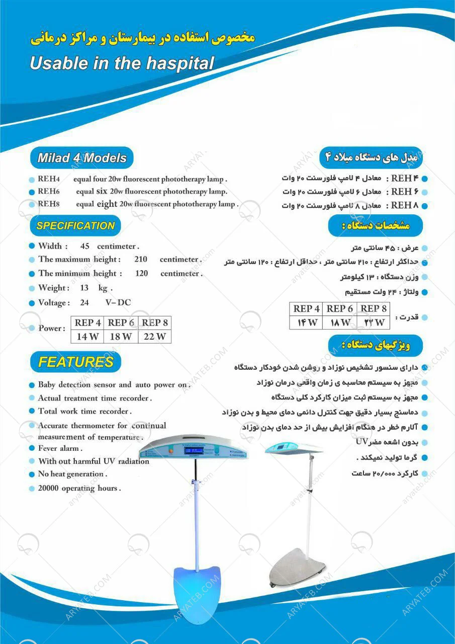 - قابلیت تنظیم مدت زمان درمان برای هر نوزاد به طور مجزا -ثبت میزان کارکرد کلی دستگاه- یکسال گارانتی و 5 سال خدمات پس از فروش