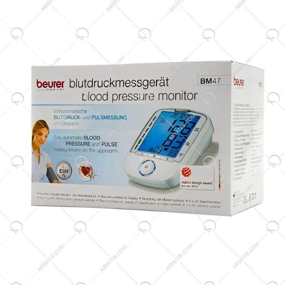 - دفترچه راهنمای فشارسنج بیورر مدل BM47 دارای سه زبان فارسی، آلمانی و انگلیسی است. و وزن نسبتا پایین این دستگاه (۳۵۱ گرم) برای افرادی مناسب است که مدام در سفرند و باید فشارسنج را همراه خود ببرند. منبع تغذیه این فشارسنج ۴ عدد باطری ۱.۵ ولتی نیم قلمی است که امکان تعویض آن ها وجود دارد. باطری ها به سادگی تعویض می شوند و امکان شارژ کردن دستگاه وجود ندارد. کاف این دستگاه برای سایز بازوی ۲۲ تا ۳۵ سانتی متر مناسب است.