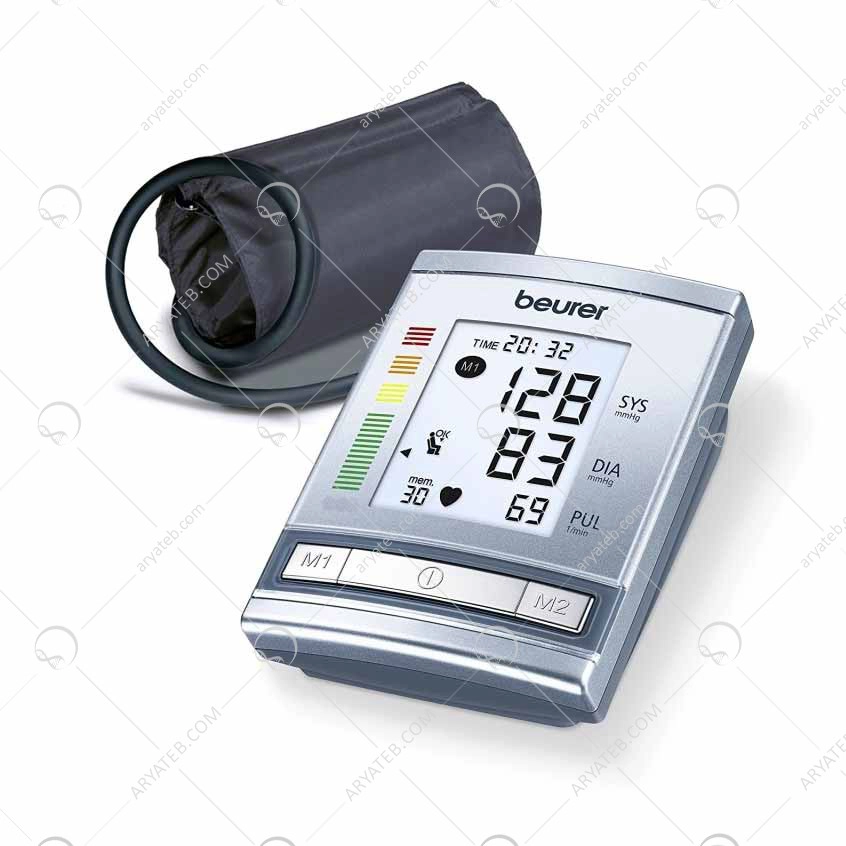 جایگاه حافظه 60*2 - رده بندی WHO/ تشخیص آریتمی (سازمان بهداشت جهانی) آریتمی ضربان قلب نامنطم می باشد. طبقه بندی و تحلیل کمیت فشار خون مطابق با جدول راهنمای سازمان بهداشت جهانی WHO فشار سنج بازویی بیورر BM60، نوار رنگی کنار دستگاه مقدار فشار خون را مطابق رده بندی WHO نشان میدهد و میتوانید فوراً وضعیت بحرانی بیمار را تشخیص دهید و اقدامات اورژانسی را تشخیص داد. تشخیص آریتمی (عملکرد هشدار دهنده مفیدی که به موقع شما را از وجود بی نظمی در ریتم قلب آگاه میکند و شما را از خطرات احتمالی دور می کند). مناسب دور بازوی 22 تا 32 سانتی متر و مدل بازویی می باشد. دارای ساعت و تاریخ خاموشی خودکار و اتوماتیک با کارکرد آسان مناسب برای افراد کم توان. پیغام هشدار اشتباه در عملیات و رفع خطا های احتمالی. نمایشگر تعویض باتری و با باتری کار می کند این محصول. دارای کیف حمل و لوازم همراه محصول : کیف ، باتری ، دفترچه راهنمای فارسی . سایر مشخصات فشارسنج بازویی بیورر BM60: نوع فشارسنج : دیجیتال بازویی می باشد و برای سایز خاص بازو مناسب می باشد که در بالا به آن اشاره شد. دارای 4 باتری قلمی 1.5 ولت. این محصول اعلام صوتی نتایج ندارد و اندازه گیری ضربان قلب ندارد اما قابلیت آریتمی دارد.