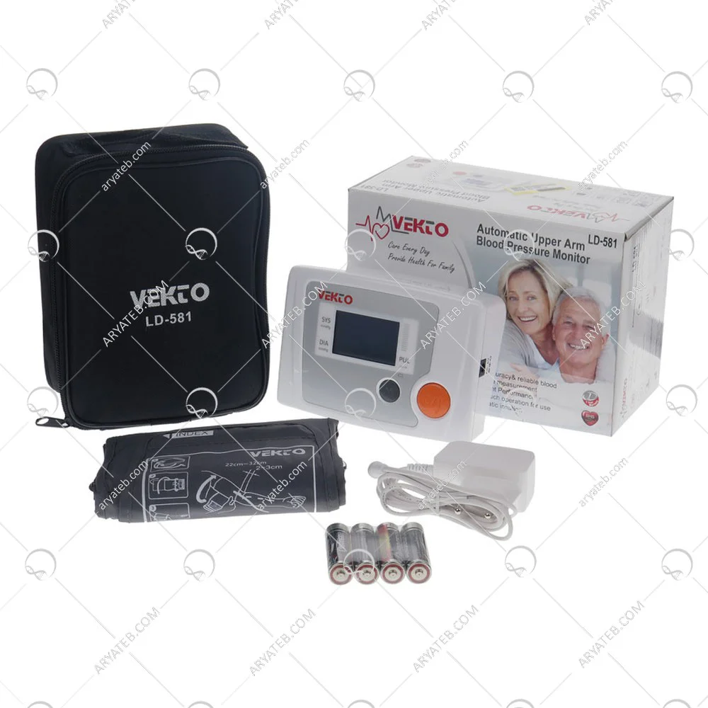 دستگاه فشارسنج دیجیتالی وکتو LD-581 همراه با اداپتور و دارای صفحه نمایش بزرگ و خواندنی است. ویژگی های این دستگاه ، اندازه گیری خودکار و هوشمند به صورت کاملا ساده (با فشار یک دکمه) و سهولت استفاده توسط افراد مسن و حتی نابینایان. قابلیت هایی مانند ذخیره 90 حافظه داخلی ، قابلیت خاموش شدن خودکار پس از عدم استفاده ، تعیین حداقل و حداکثر فشار ، اندازه گیری ضربان قلب و تشخیص ضربان نامنظم قلب از دیگر ویژگی های این دستگاه است. یک ویژگی مهم جدید این دستگاه الگوریتم فازی است ، الگوریتمی برای پردازش هر ضربان قلب ، که دقت اندازه گیری بالایی را ارائه می دهد. ضربان قلب حداقل حداکثر ضربان قلب و تشخیص ضربان نامنظم قلب را تشخیص داده و نمایش می دهد.
