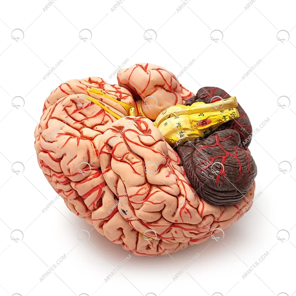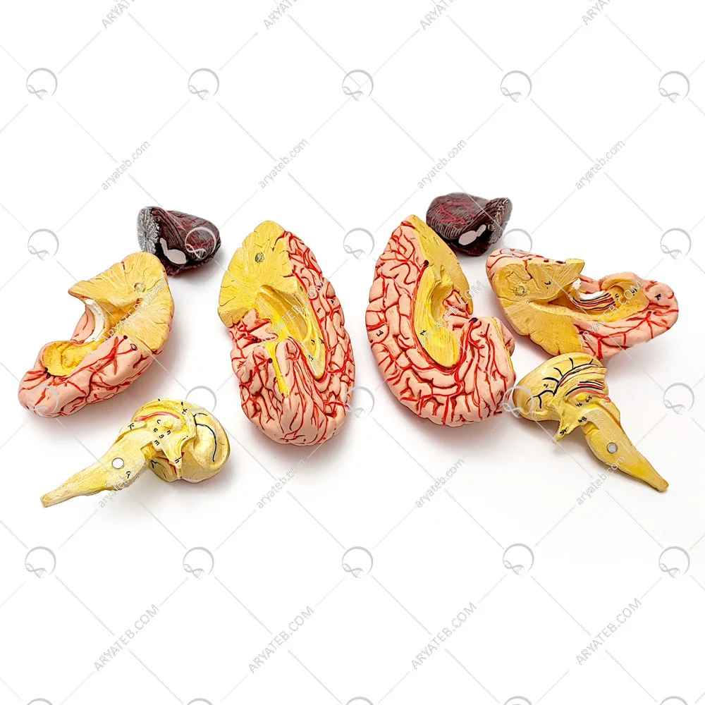 مولاژ مغز 8 تکه (مدلهای پیشرفته): این مدلها اجازه تفکیک کامل اجزای اصلی را میدهند؛ نیمکرهها (به صورت چپ و راست)، مخچه و ساقه مغز (شامل پونز، مدولا و میانسرا) به صورت قطعات جداگانه در دسترس هستند و گاهی حتی بخشهایی از جسم پینهای (Corpus Callosum) قابل مشاهده هستند.