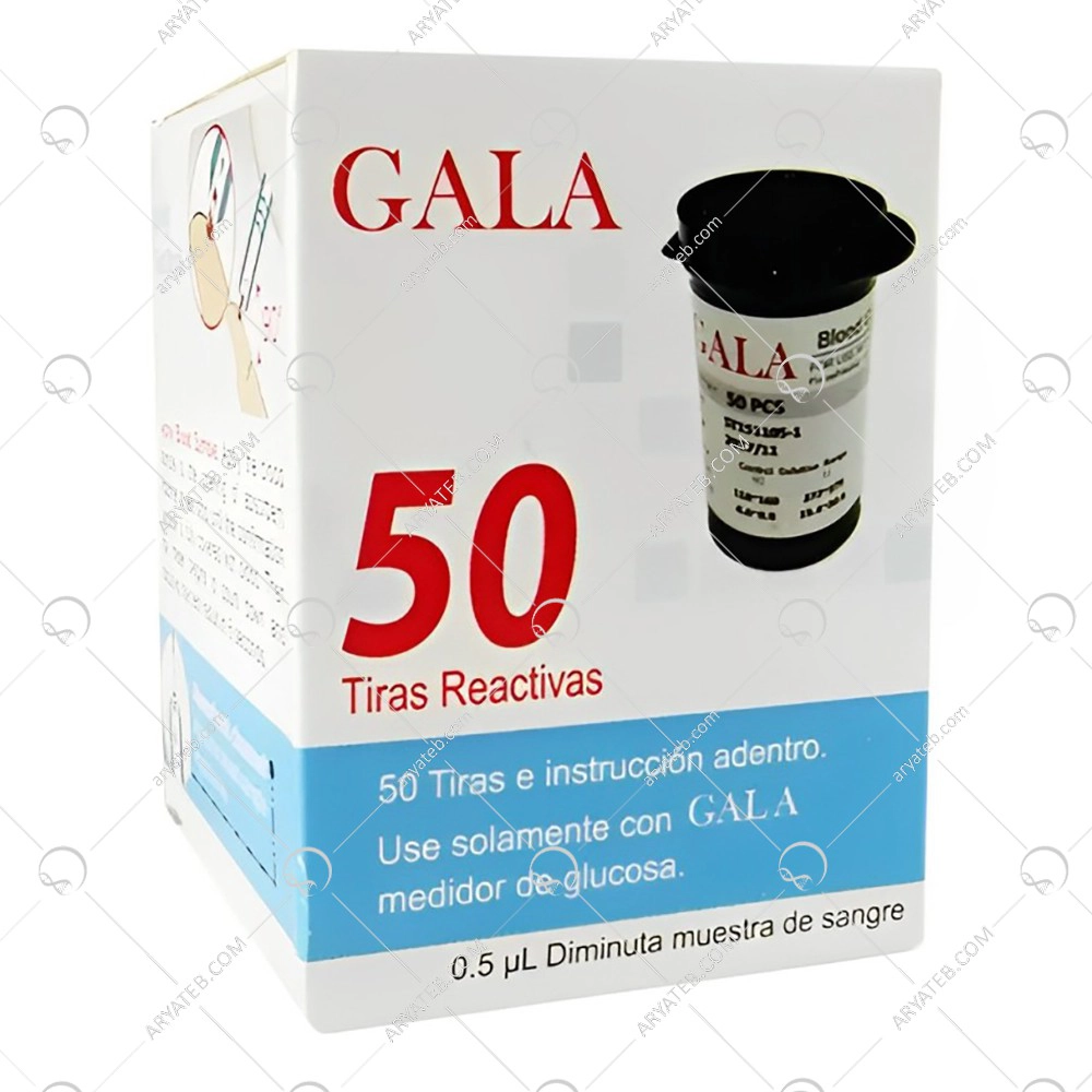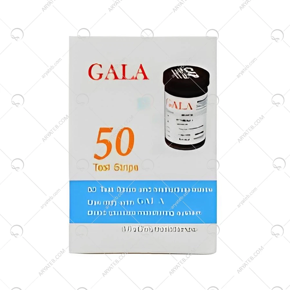 طراحی گرافیکی: جعبه دارای طراحی گرافیکی مشخص برند "گالا" است که معمولاً شامل رنگهای روشن و جذاب، فونتهای خوانا و تصاویری از نوار تست و گلوکومتر مربوطه میباشد. طراحی باید حرفهای و بهداشتی به نظر برسد.