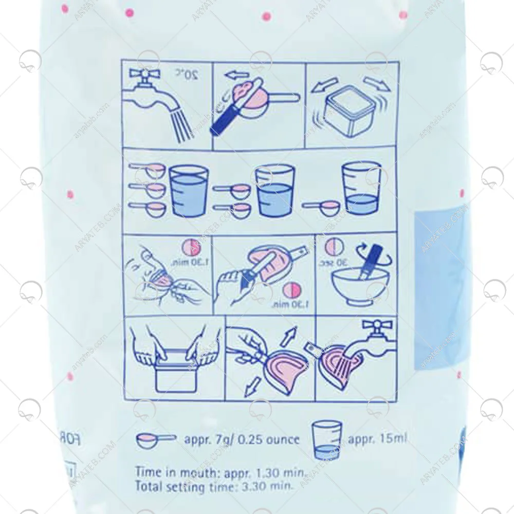 برای استفاده، پودر را با آب (طبق نسبت مشخص) مخلوط کنید تا خمیر صاف شود. آن را در تری قرار دهید و در دهان بگذارید. پس از ستینگ، خارج کنید و گچ بریزید. نکات: از آب اتاق استفاده کنید تا زمان ستینگ ثابت بماند.
