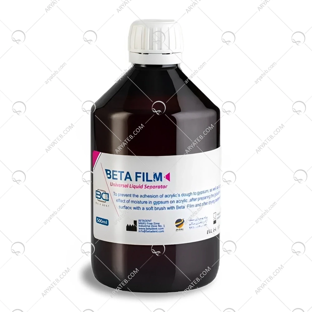 بتا فیلم یک مایع جداکننده تخصصی است که توسط شرکت بتادنت تولید میشود و به منظور تسهیل فرآیند جداسازی گچ از آکریل در ساخت پروتزهای دندانی مورد استفاده قرار میگیرد. این محصول با تشکیل یک لایه نازک و یکنواخت بر روی سطح گچ، از چسبیدن آکریل به گچ جلوگیری کرده و در نتیجه، جداسازی پروتز از قالب را بسیار آسانتر میکند.