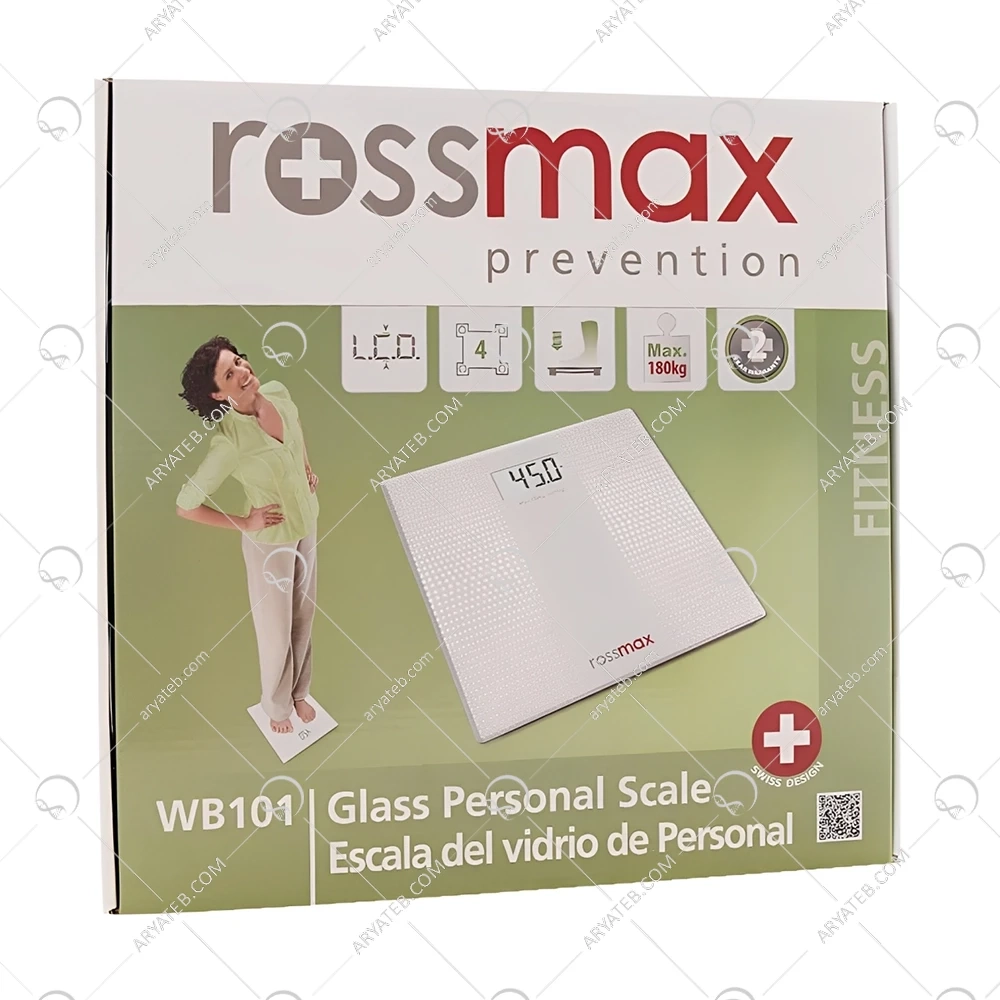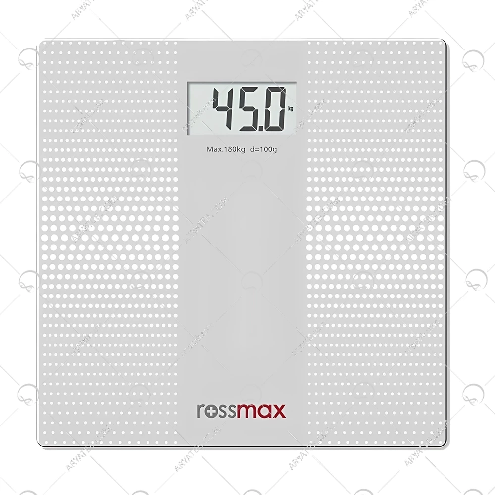 برندینگ (لوگو): لوگوی برند "ROSSMAX" معمولاً به صورت چاپ شده یا حک شده با رنگی متضاد (اغلب سفید یا نقرهای) در قسمت پایین یا مرکزی صفحه شیشهای ترازو قابل مشاهده است. این لوگو به زیبایی و شناسایی محصول کمک میکند.