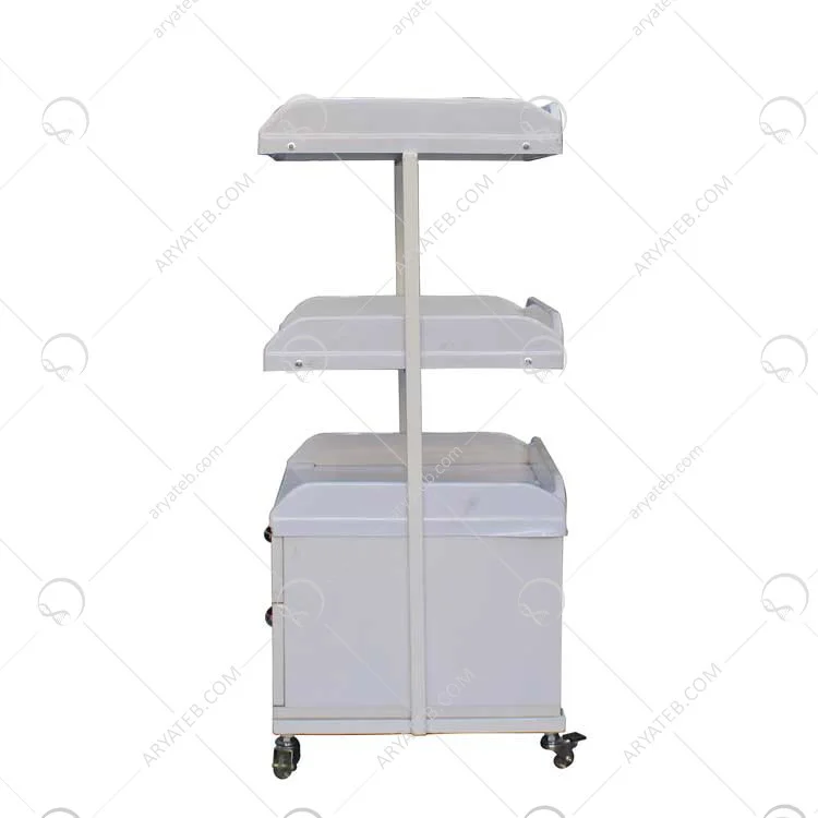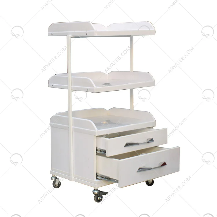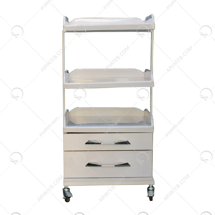 ترالی چرخشی: ترالی با تحرک و طراحی براق مشخص می شود. معمولاً از چندین قفسه یا سینی باز تشکیل شده است که امکان دسترسی آسان به موارد پرکاربرد را فراهم می کند. این نوع ترالی برای نگهداری سریع و راحت ابزارها و محصولات در طول درمان یا خدمات ایده آل است. طراحی باز نیز تمیز کردن و نگهداری آن را آسان می کند.