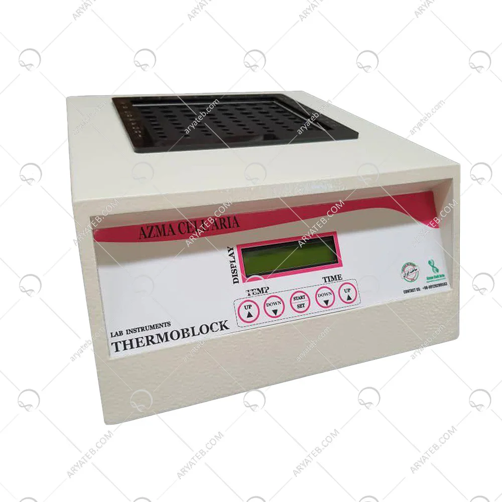 ترموبلاک یا هیت بلاک یا درای بلاک نام وسیله ایی برای انجام تست های مولکولی می باشد که در مرحله استخراج بیشتر کاربرد دارد میکروتیوپ ها پس از ریختن معرف و آنزیم ها در درای بلاک قرار داده شده تا در دمای مورد نیاز آنزیم ها فعال گردد و واکنش سنتز cDNA یا سایر فرایند ها اتفاق بیفتد دستگاه ترموبلاک شرکت آزما سلول مجهز به برد PID بوده و دفت دمایی بسیار بالایی دارد همچنین سطح آلومینیومی آنادایز گشته ترموبلاک که از برق گرفتگی و اکسید شدن سطح جلوگیری می کند . هیت بلاک طراحی شده توسط آزما سلول دارای هم دمایی کامل در تمام چاهک ها می باشد . همچنین بدنه در مقابل اتصالات برقی نارسانا و در هنگام کارکردن داغ نمی شود
