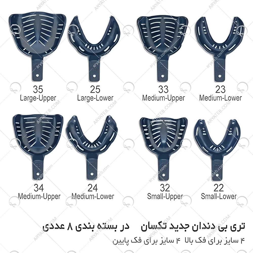 - تری بی دندان کامل: برای قالبگیری از تمام فک بالا یا پایین استفاده میشود.