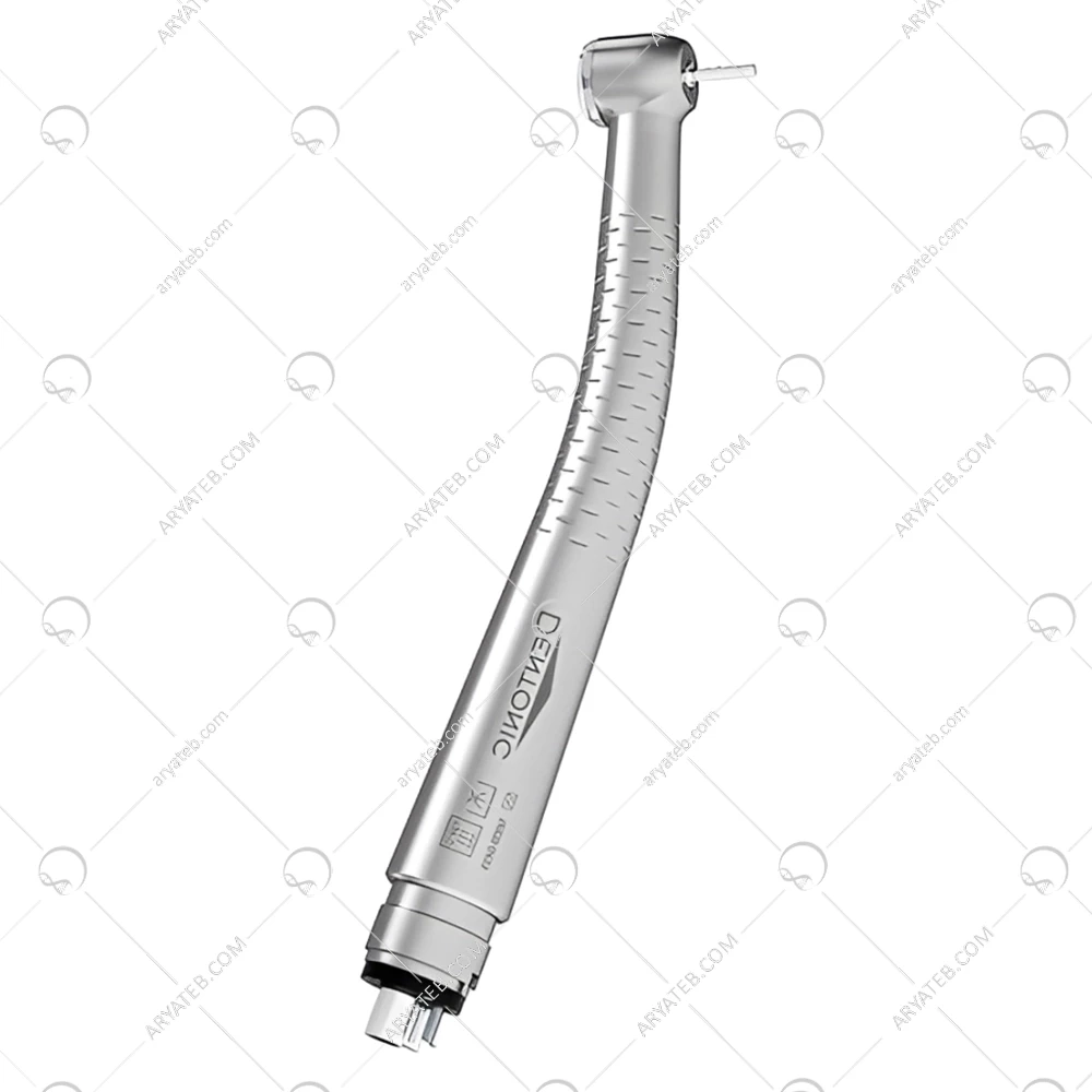1. طراحی کلی و ابعاد: توربین دنتونیک معمولاً دارای یک طراحی مدرن، فشرده و ارگونومیک است. شکل آن معمولاً به گونهای است که به راحتی در دست دندانپزشک جای گیرد و کنترل دقیق را فراهم کند. بدنه آن باریک و با انحناهای ملایم است. ابعاد کلی توربین، از طول تا قطر هد، به گونهای بهینه شده که دسترسی به تمام نواحی حفره دهان، به خصوص دندانهای خلفی، را آسان کند و دید دندانپزشک را مختل نکند. وزن آن نیز سبک و متعادل است تا خستگی دست را در طول درمانهای طولانیمدت به حداقل برساند.