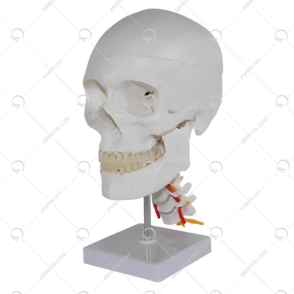 اندازه واقعی جمجمه انسان با مدل مهرههای گردنی، نمایش دقیق آناتومیکی استخوانهایی است که جمجمه و گردن را تشکیل میدهند. به طور معمول شامل استخوان های جمجمه، از جمله استخوان های پیشانی، جداری، گیجگاهی، پس سری، اسفنوئید و اتموئید و همچنین مهره های گردنی است که شامل هفت استخوان گردن می شود.