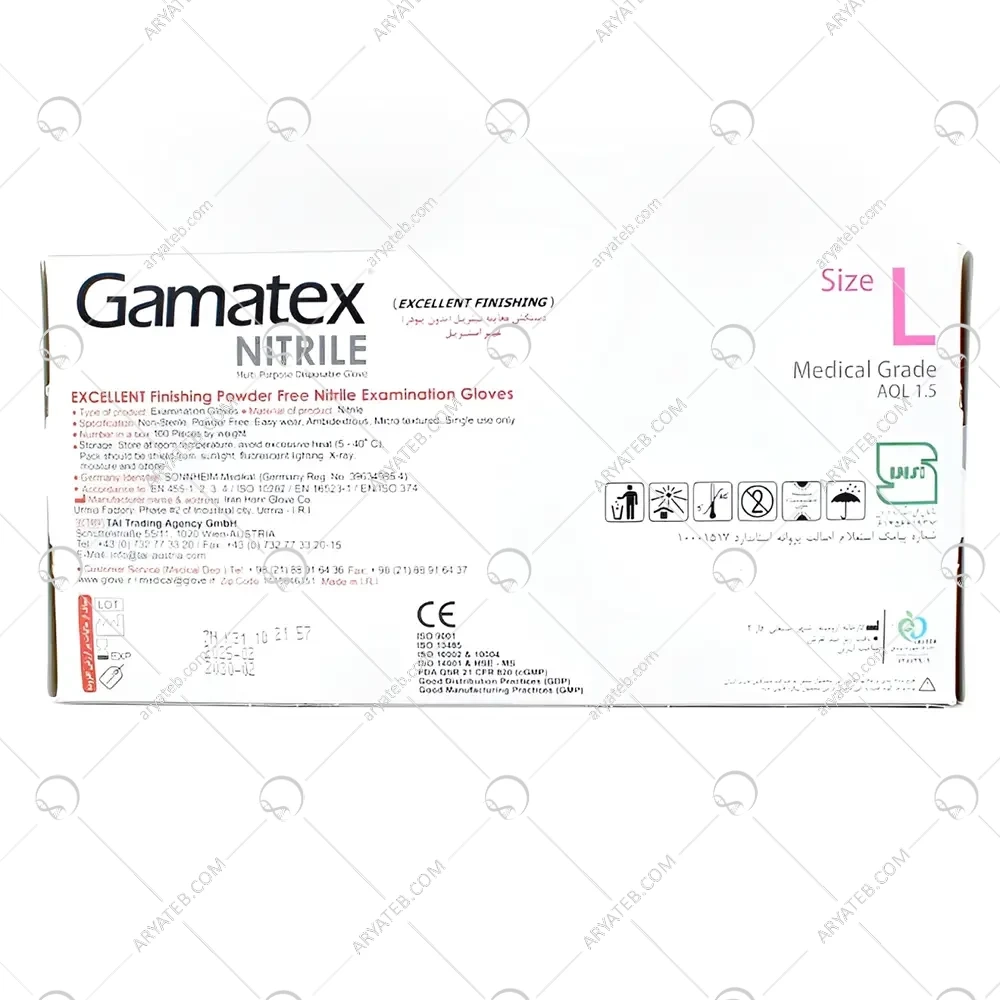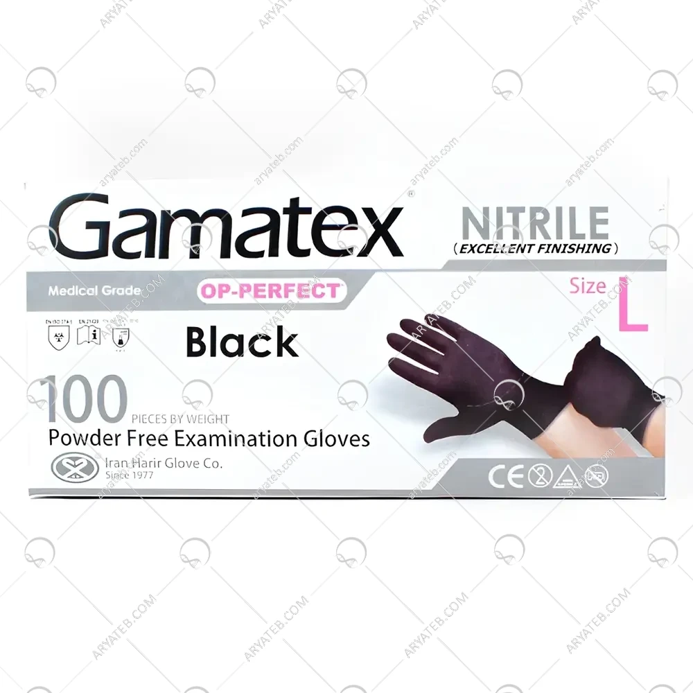 دستکش نیتریل مشکی گاماتکس در سایزهای کوچک (S)، متوسط (M)، بزرگ (L) و خیلی بزرگ (XL) عرضه میشود تا برای انواع اندازههای دست مناسب باشد. -