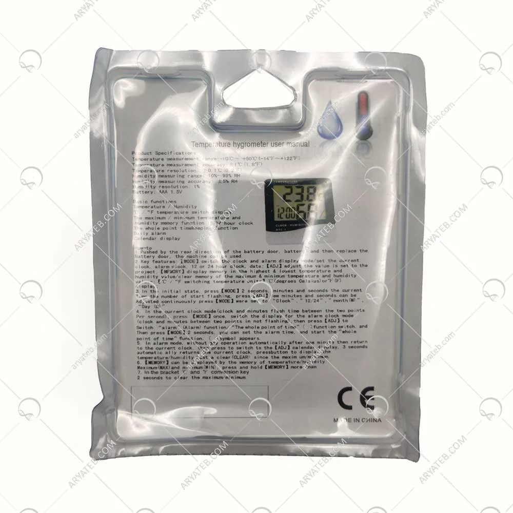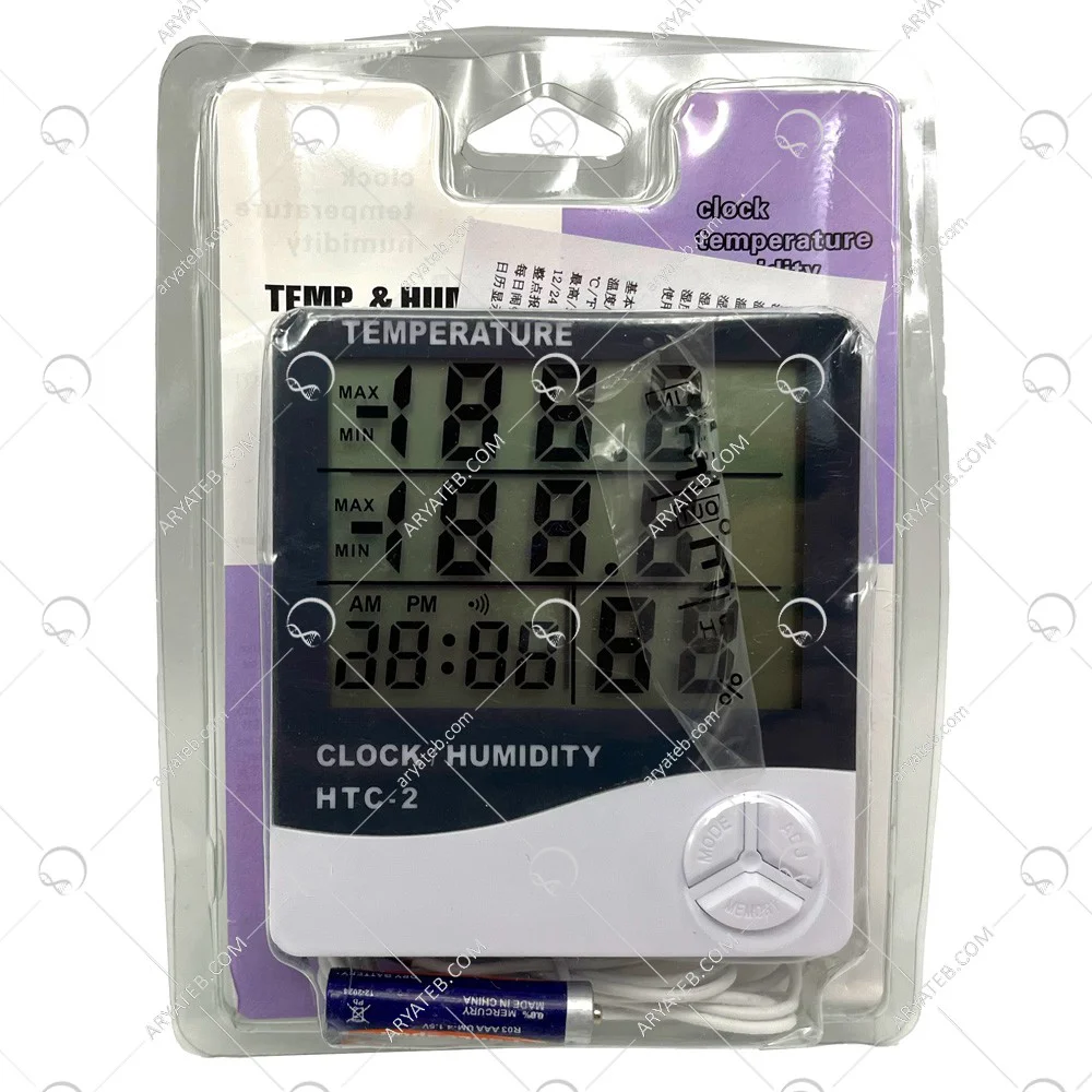 دماسنج دیجیتال سنسوردار در یکی از معتبرترین کارخانه جات تولید کننده لوازم آزمایشگاهی در چین تولید شده و از کیفیت ، دوام بالا و دقت بسیار قابل اعتمادی برخوردار است در ساخت این دستگاه از مواد درجه یک استفاده شده است. این رطوبت سنج و دماسنج دیجیتالی سنسور دار انرژی بسیار کمی مصرف میکند و می تواند تنها با یک عدد باتری نیم قلمی تا مدت ها بدون مشکل کار خود را انجام دهد . سایز صفحه نمایش و درشتی اعداد نمایش داده شده بر روی نمایشگر آن ، باعث می شود تا بتوان ارقام نمایش داده شده در این دستگاه را به راحتی مشاهده نمود . منظور از درج سه خانه این است که در نمایشگر این دماسنج و رطوبت سنج ، شاهد سه ردیف دیجیتالی هستیم که بطور پیش فرض ردیف اول آن دما و MAX-MIN سنسور داخلی ، ردیف دوم میزان دما و بیشینه کمینه سنسور خارجی و MAX/MIN ، ردیف سوم میزان رطوبت بر حسب درصد و تاریخ و سیستم ساعت بیدار باش دستگاه را نمایش می دهد که به این حالت نمایش سه ردیفی در اصطلاح واژه سه خانه می گویند . از رطوبت سنج و دماسنج دیجیتالی HTC _2 می توانید هم بروی میز و هم بروی دیوار همانند یک ساعت دیواری استفاده نمائید . در بخش پشتی این دستگاه یک قطعه پلاستیکی وجود دارد که اگر آن را به حالت مورب باز نمائید حکم پایه را پیدا کرده و می توانید با کمک آن ، دستگاه را مانند یک ساعت رومیزی بروی میز تحریر خود قرار دهید . در بخش پشتی این دماسنج رطوبت سنج سنسور دار یک سوراخ برای آویزان ماندن بروی میخ وجود دارد.