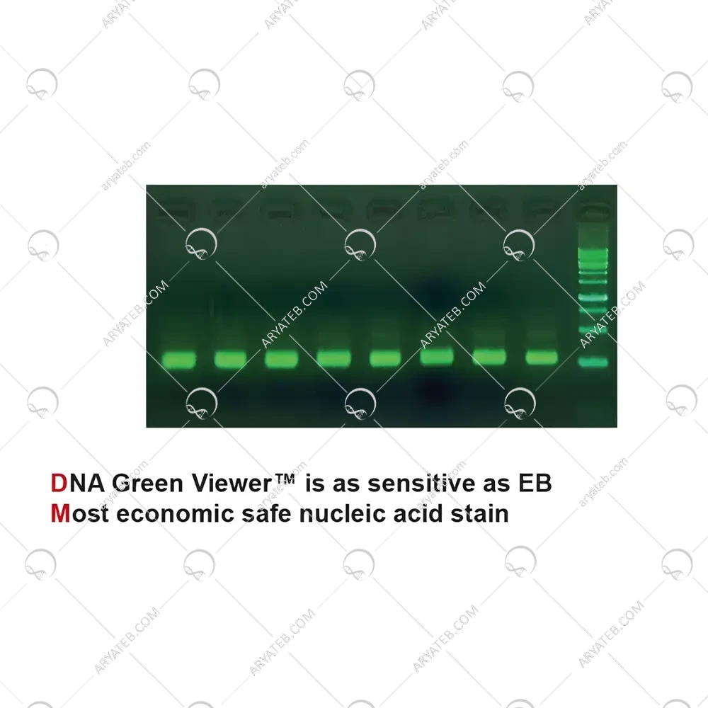 DNA دورشتهای (dsDNA): هنگام اتصال به dsDNA، DNA Green Viewer™ فلورسانس سبز ساطع میکند. شدت این فلورسانس به طور مستقیم با مقدار dsDNA موجود در ژل آگارز متناسب است و امکان تشخیص و تعیین اندازه باندهای DNA را فراهم میسازد.