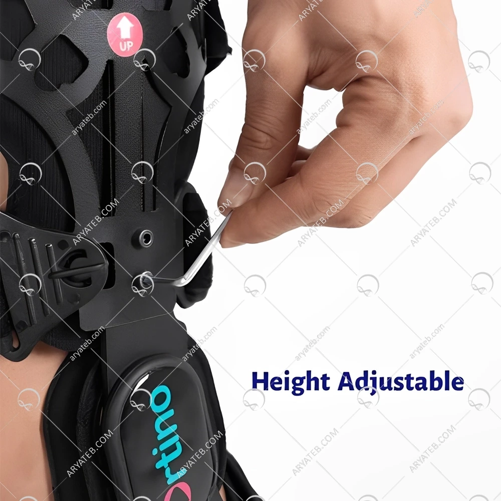 تنظیم دقیق برای انطباق با آناتومی فردی: قابلیت تنظیم ارتفاع: یکی از مزایای بارز زانوبند پای پرانتزی اورتینو، امکان تنظیم ارتفاع آن در دو ناحیه ران و ساق پا است. این قابلیت، تنظیم دقیق سیستم سه نقطه فشار را بر اساس قد و ساختار بدنی بیمار امکانپذیر میسازد و به افزایش چشمگیر کارایی زانوبند کمک میکند. تنظیم صحیح ارتفاع، بهویژه برای افراد با قامتهای متفاوت، از اعمال نیروی نامناسب و فشار اضافی بر مفصل زانو جلوگیری کرده و اثربخشی درمان را بهینه میسازد. تغییر ارتفاع این زانوبند آرتروز به سادگی و در عرض چند ثانیه قابل انجام است.