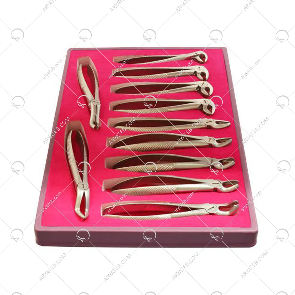 ست فورسپس دندانپزشکی شامل سانترال بالا پره مولر بالا پره مولر پایین مولر بالاچپ مولر بالا راست مولر پایین ریشه کش بالا ریشه کش پایین عقل بالا عقل پایین کاهورن پایین