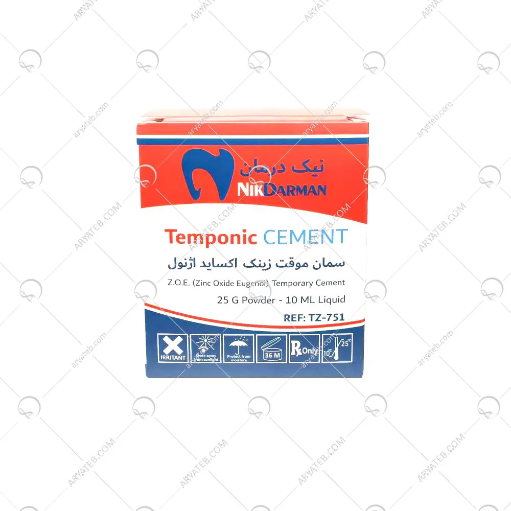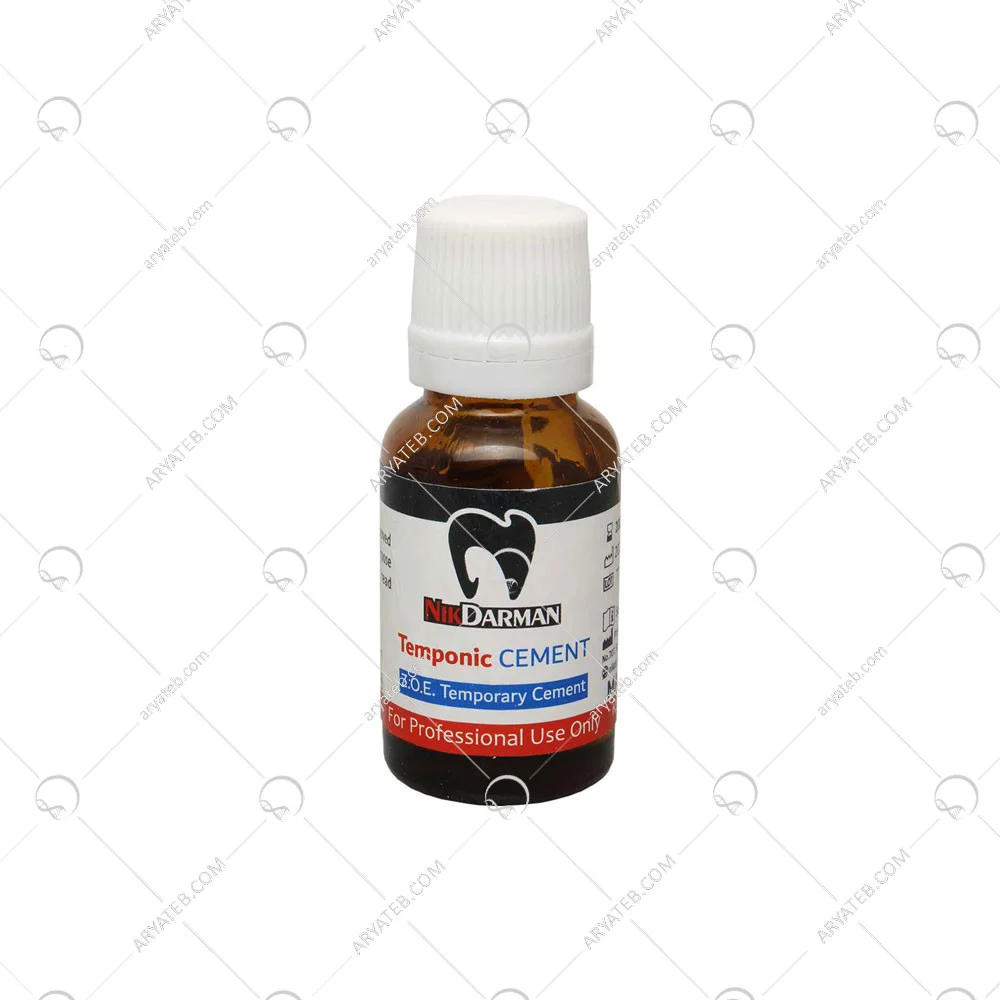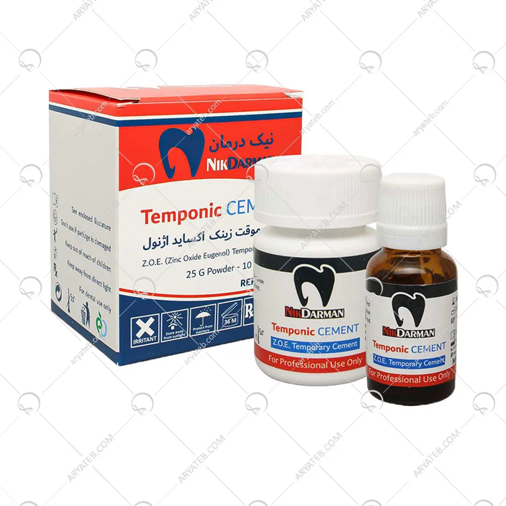 سمان موقت نیک درمان حاوی اکسید روی، رزین و استات روی در پودر است. رزین مقاومت به شکست را افزایش می دهد و استات روی در تسریع سرعت واکنش موثر است. این مایع، آمادهسازی اوژنول است که با پودر واکنش میدهد و یک کلات آمورف از اوژنولات روی تشکیل میدهد. سمان موقت نیک درمان برای ایجاد یک اثر آرام بخش در آماده سازی های عمیق استفاده می شود، اما مقاومت فشاری پایین آنها محدودیت های بالینی را نشان می دهد. سیمان موقت زینک اکسید اوژنول دندانی دارای مزایای متعددی نسبت به مواد دیگر است. استفاده از آن آسان است و نیازی به استفاده از مته یا تجهیزات دیگر ندارد. همچنین ویسکوزیته پایینی دارد که اجازه نفوذ بهتر به داخل حفره را می دهد و نسبتاً ارزان است. علاوه بر این، حلالیت نسبتاً کمی دارد و چسبندگی خوبی به ساختار دندان دارد.