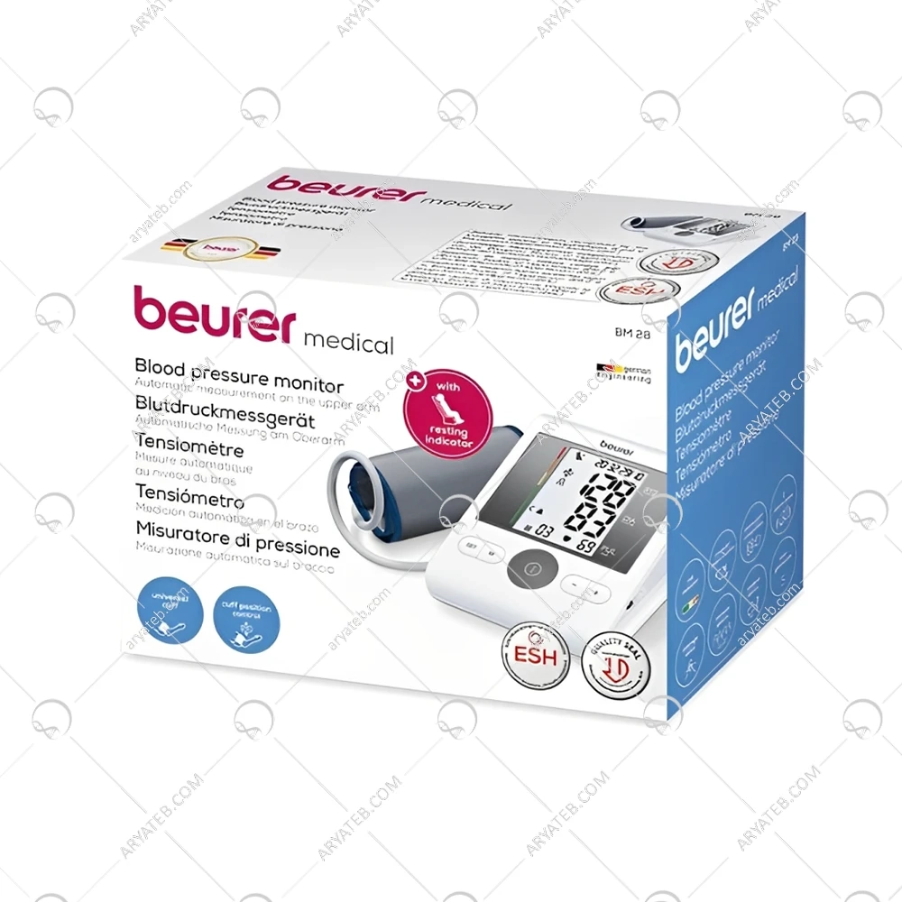 فشارسنج بیورر مدل BM28 یک دستگاه تمام اتوماتیک برای اندازهگیری فشار خون و ضربان قلب است. این دستگاه دارای صفحه نمایش بزرگ و خوانا بوده و قابلیت تشخیص آریتمی (نامنظمی ضربان قلب) را دارد. BM28 امکان ذخیره نتایج برای چهار کاربر را فراهم میکند و هر کاربر میتواند تا ۳۰ نتیجه را در حافظه دستگاه ذخیره کند. کاف این فشارسنج مناسب برای دور بازوی ۲۲ تا ۴۲ سانتیمتر است. منبع تغذیه دستگاه باتری است و نشانگر تعویض باتری نیز دارد. همچنین، این مدل دارای قابلیت خاموشی خودکار و نمایش تاریخ و ساعت است.