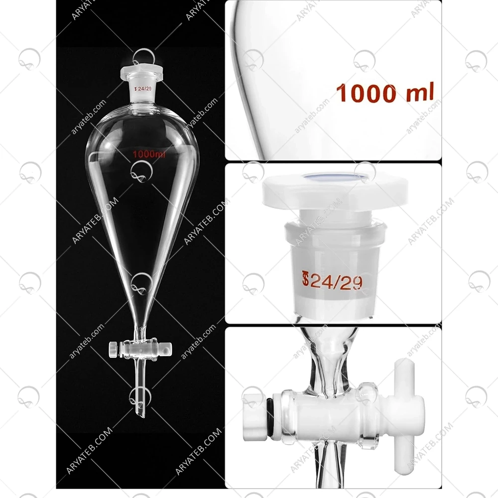 دکانتر شیر تفلون یک وسیله شیشه ای با یک دریچه در پایین و یک درب در بالا است که با بازکردن دریچه می توانید دو مایع مختلف را در یک محدوده سیال جدا کرده و آنها را ببندید.