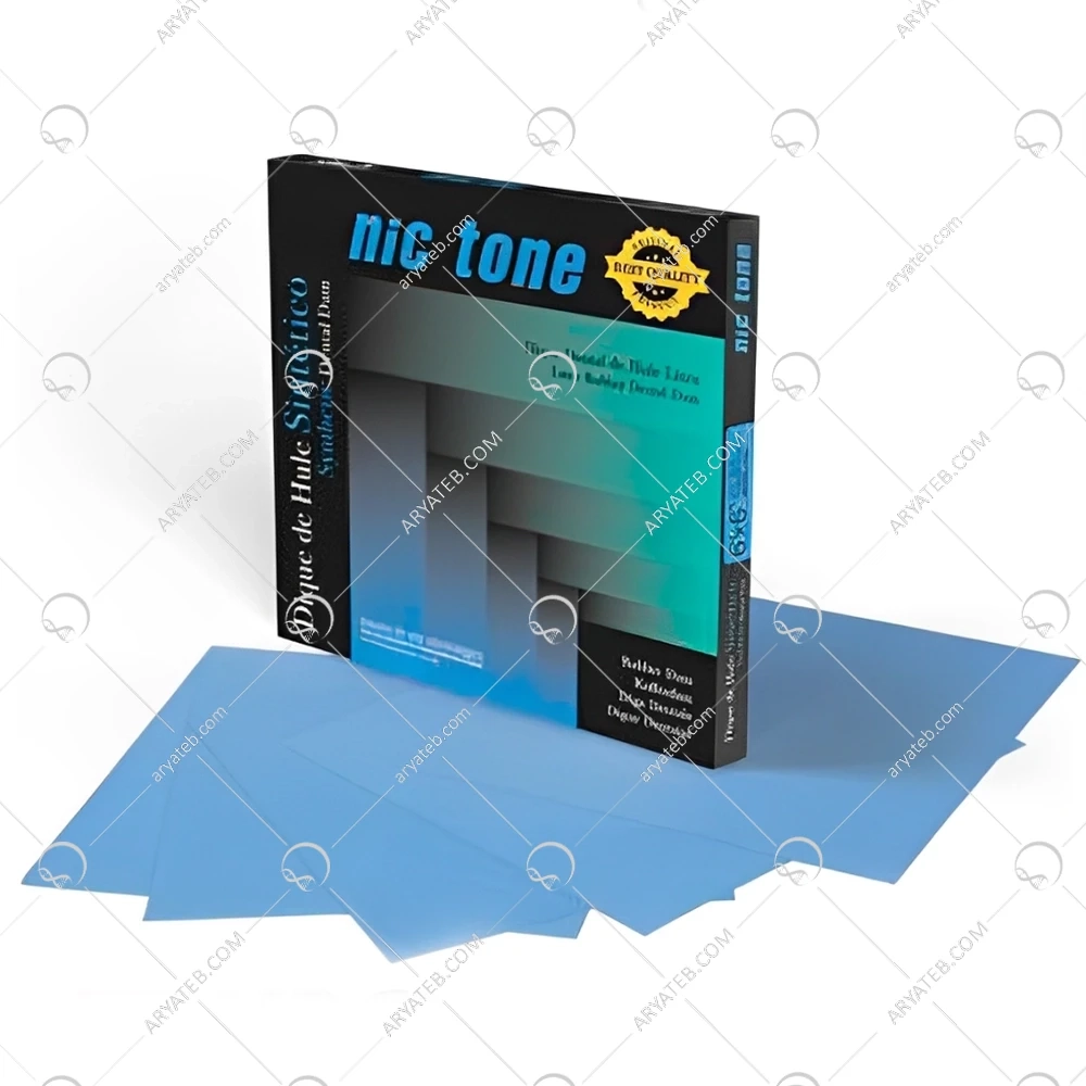 لاستیک رابردم Synthetic نیکتون Nictone به صورت ورقههای مربعی با ابعاد 15.24×15.24 سانتیمتر و ضخامت 0.15-0.18 میلیمتر عرضه میشود. رنگهای آبی یا سبز و طعم نعنایی (در برخی مدلها) تجربه بیمار را بهبود میبخشند. بافت نرم و انعطافپذیر ورقه، نصب را آسان کرده و با آناتومی دهان بهخوبی تطبیق مییابد. ظاهر حرفهای و ساده آن شناسایی و استفاده در محیط کلینیکی را تسهیل میکند.