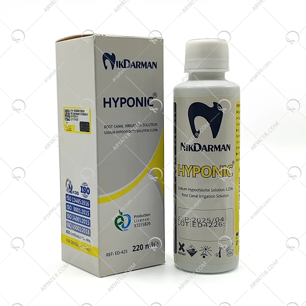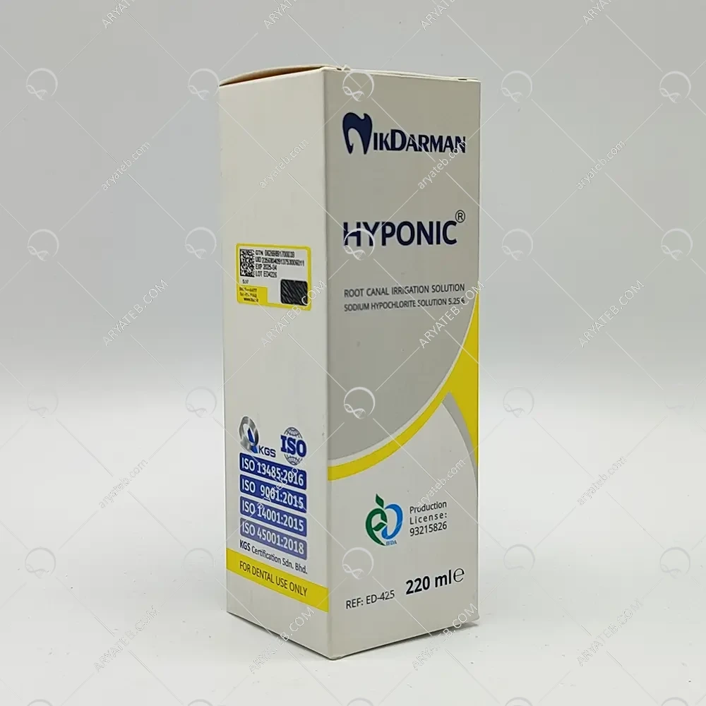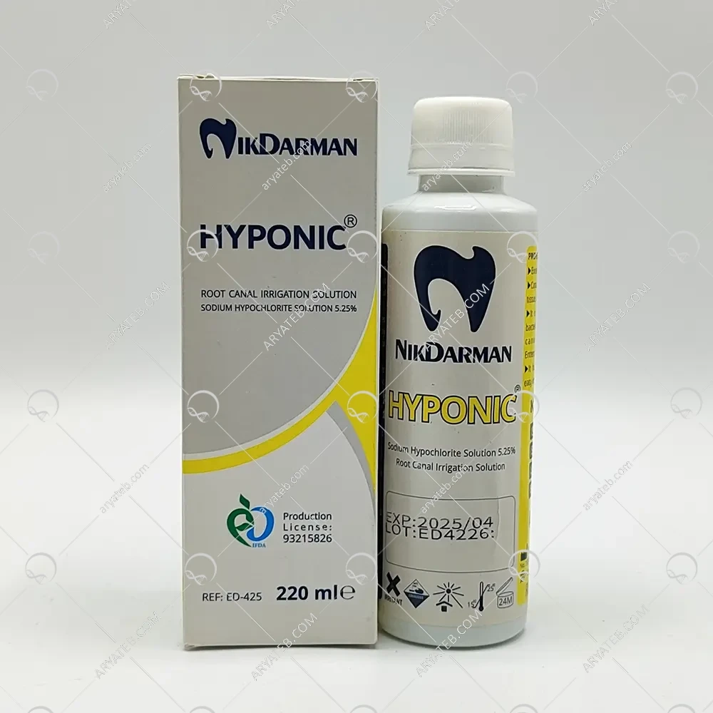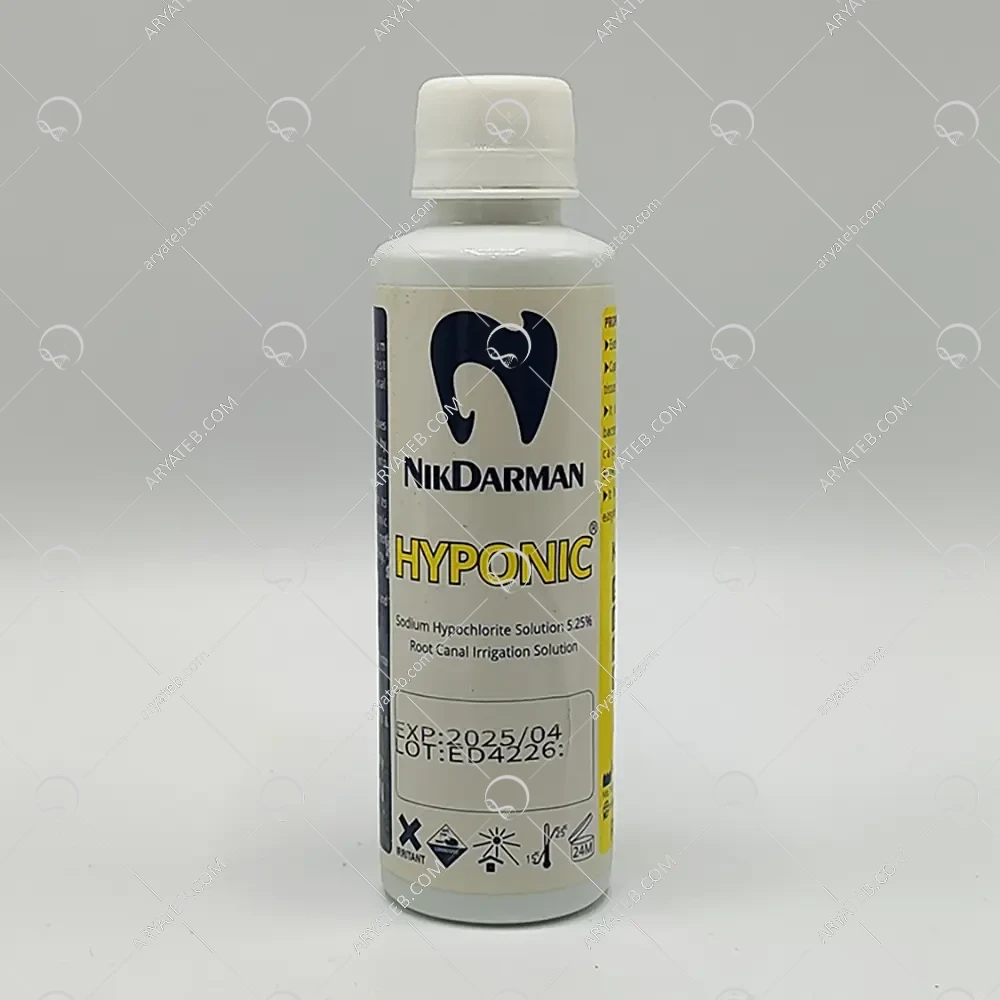 محلول هیپوکلریت سدیم نیک درمان معمولاً از ترکیب هیپوکلریت سدیم (NaOCl) با آب دیونیزه یا مقطر تشکیل میشود. هیپوکلریت سدیم یک ترکیب شیمیایی است که از واکنش بین سدیم هیدروکسید و کلر ایجاد میشود و به دلیل ویژگیهای اکسیدکنندگی بالای خود، به عنوان یک ماده ضدعفونیکننده در بسیاری از صنایع پزشکی و دندانپزشکی به کار میرود.