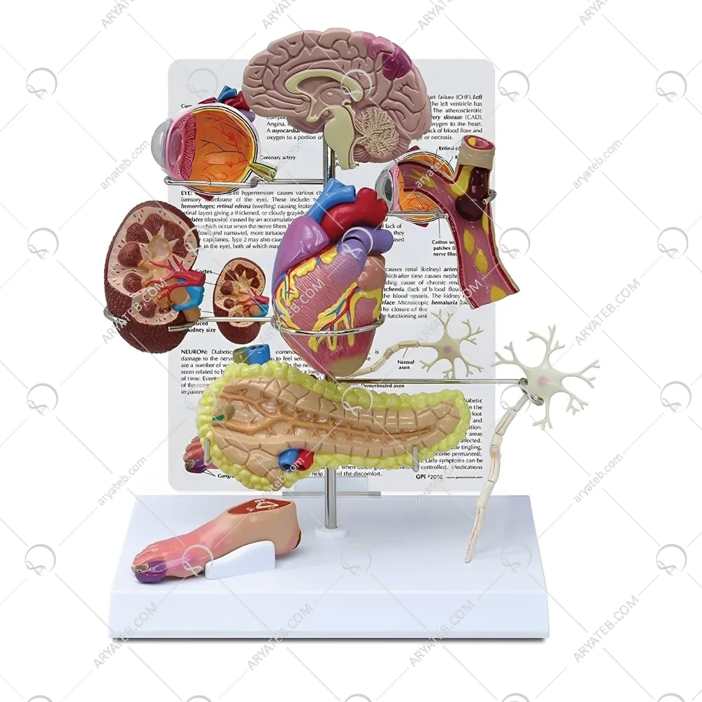 تمام مدلها بر روی یک پایه تک پایه قرار گرفتهاند که امکان مشاهده و بررسی هر یک از آنها را بهطور مجزا و دقیق فراهم میآورد. این مولاژ نه تنها به دانشجویان پزشکی و پرستاری بلکه به پزشکان و مربیان بهداشت نیز کمک میکند تا با اثرات جدی دیابت آشنا شوند و اطلاعات لازم را به بیماران و خانوادههای آنها انتقال دهند. با استفاده از این مولاژ، میتوان بهطور مؤثری آموزشهای مربوط به پیشگیری و مدیریت دیابت را ارائه کرد و اهمیت کنترل این بیماری را به تصویر کشید.