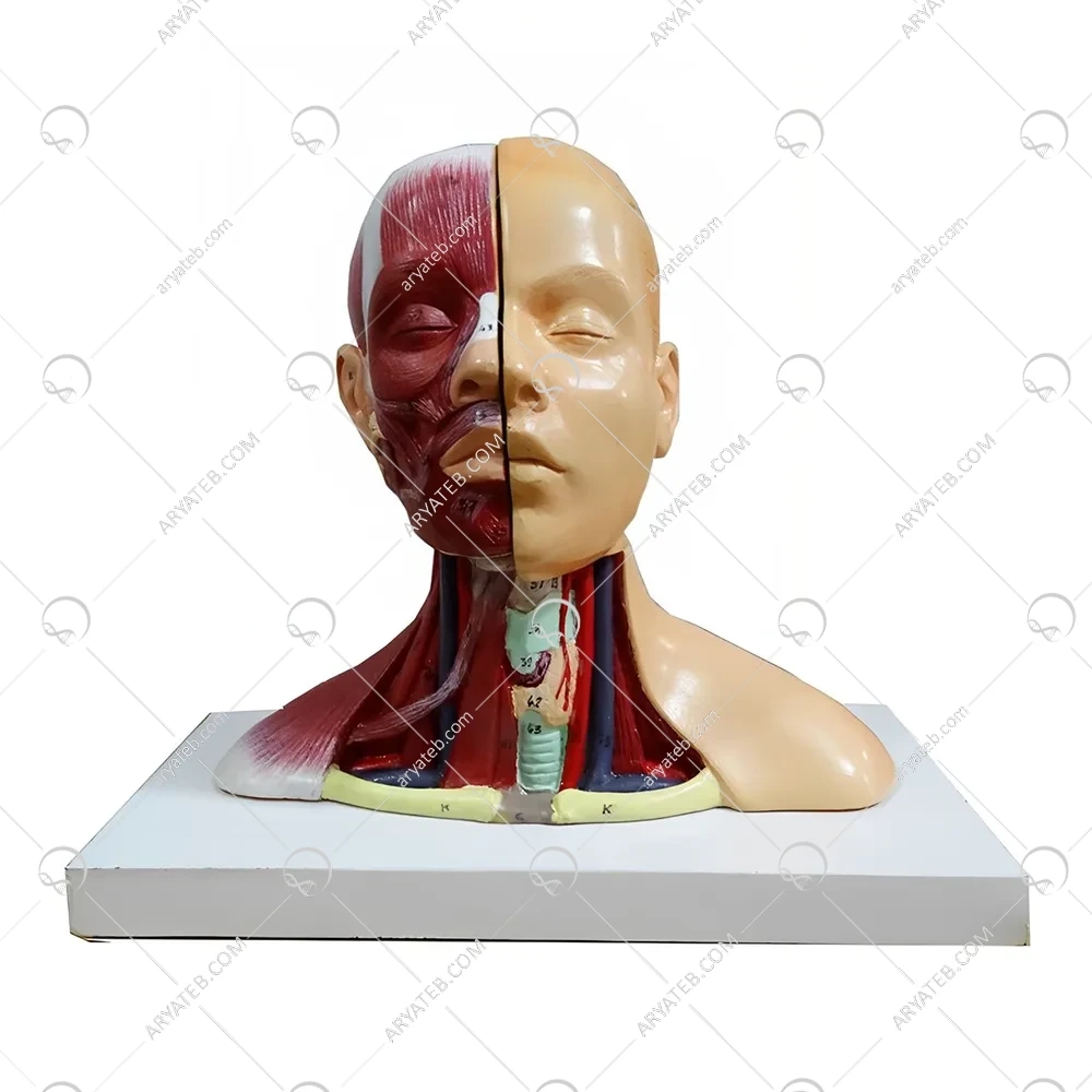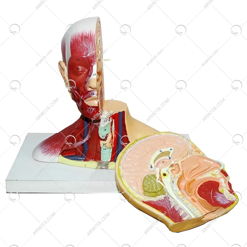 نمایش دقیق عضلات: این مولاژ شامل عضلات اصلی سر و گردن، از جمله عضلات صورت، گردن و فک است که به وضوح نشان داده شدهاند.