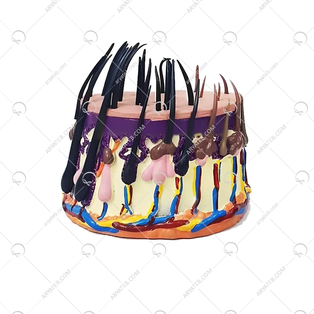 - مولاژ شامل اپیدرم، درم، و لایههای زیر جلدی پوست است که تمامی اجزای مربوط به رشد مو مانند فولیکولها، غدد چربی و مویرگها به خوبی نشان داده شدهاند.