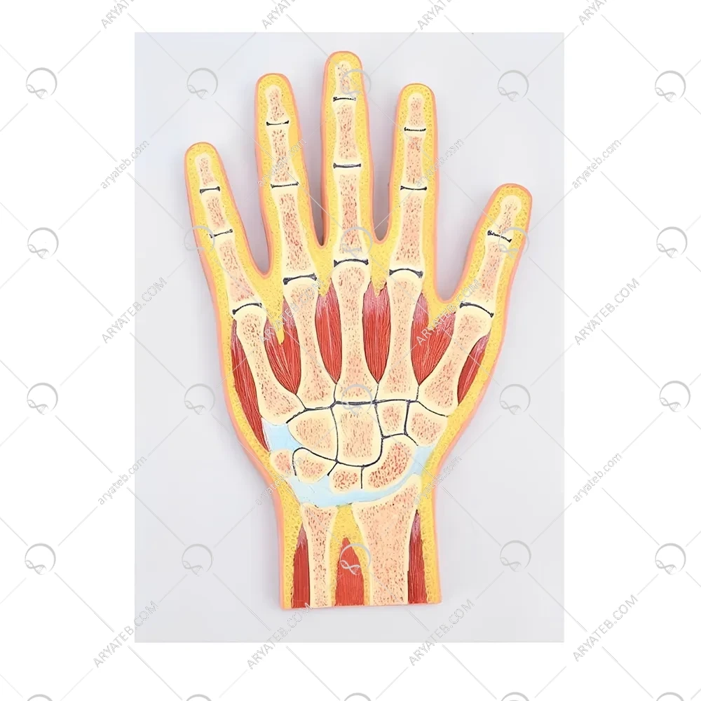- این مولاژ بخشهایی از دست را به صورت مقطعی نمایش میدهد و امکان مشاهده ساختارهای درونی از جمله استخوانها، عضلات، تاندونها و اعصاب فراهم میکند.