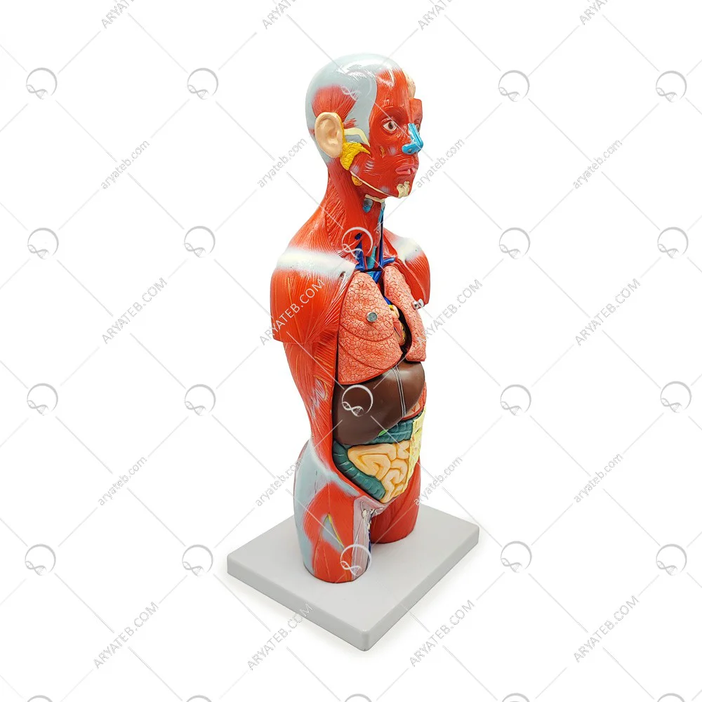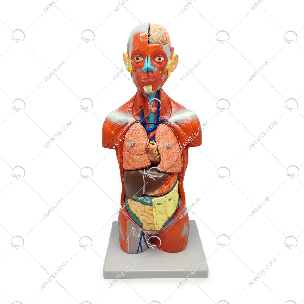 مولاژ نیم تنه بدن با نمایش عضلات ابزاری کارآمد برای یادگیری آناتومی و فیزیولوژی سیستم عضلانی انسان است و به درک بهتر حرکات و عملکردهای بدن کمک میکند.