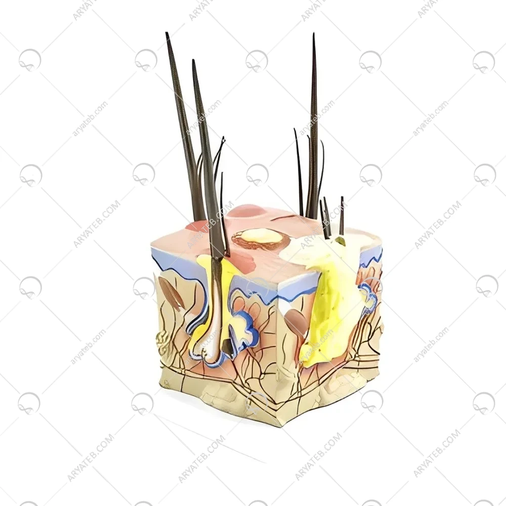 - این مولاژ شامل لایههای مختلف پوست، از جمله اپیدرم، درم و بافت چربی زیرپوستی است. همچنین، ساختار موها و ویژگیهای مرتبط با آنها مانند فولیکولها و غدد چربی نیز بهوضوح نمایش داده میشود.
