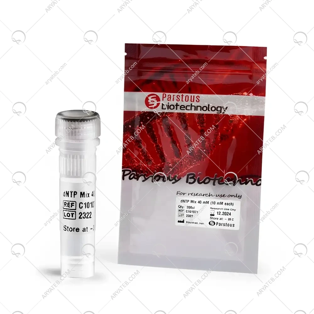 میکس dNTP پارس توس یک محلول آبی شفاف و پایدار است که حاوی چهار نوع دئوکسینوکلئوتید تریفسفات ضروری برای سنتز DNA است: