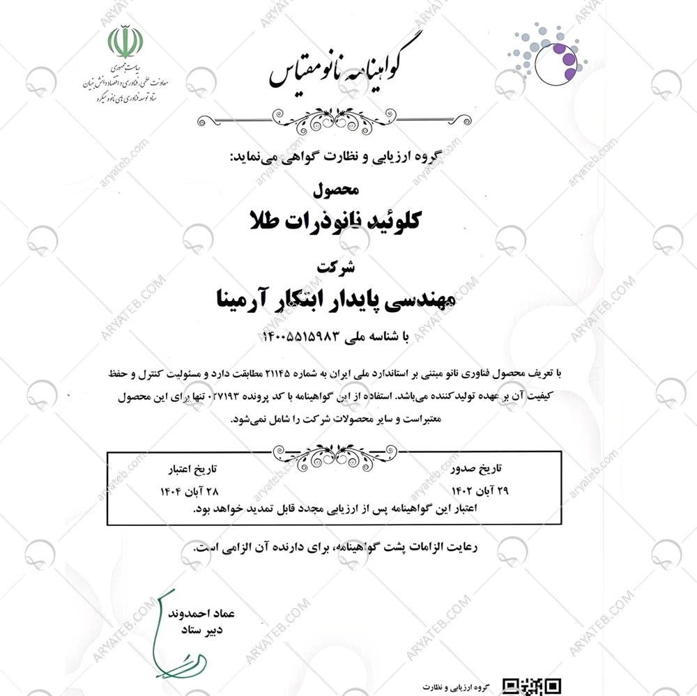 ویژگیهای نانو کلوئید طلای ارمینانو: