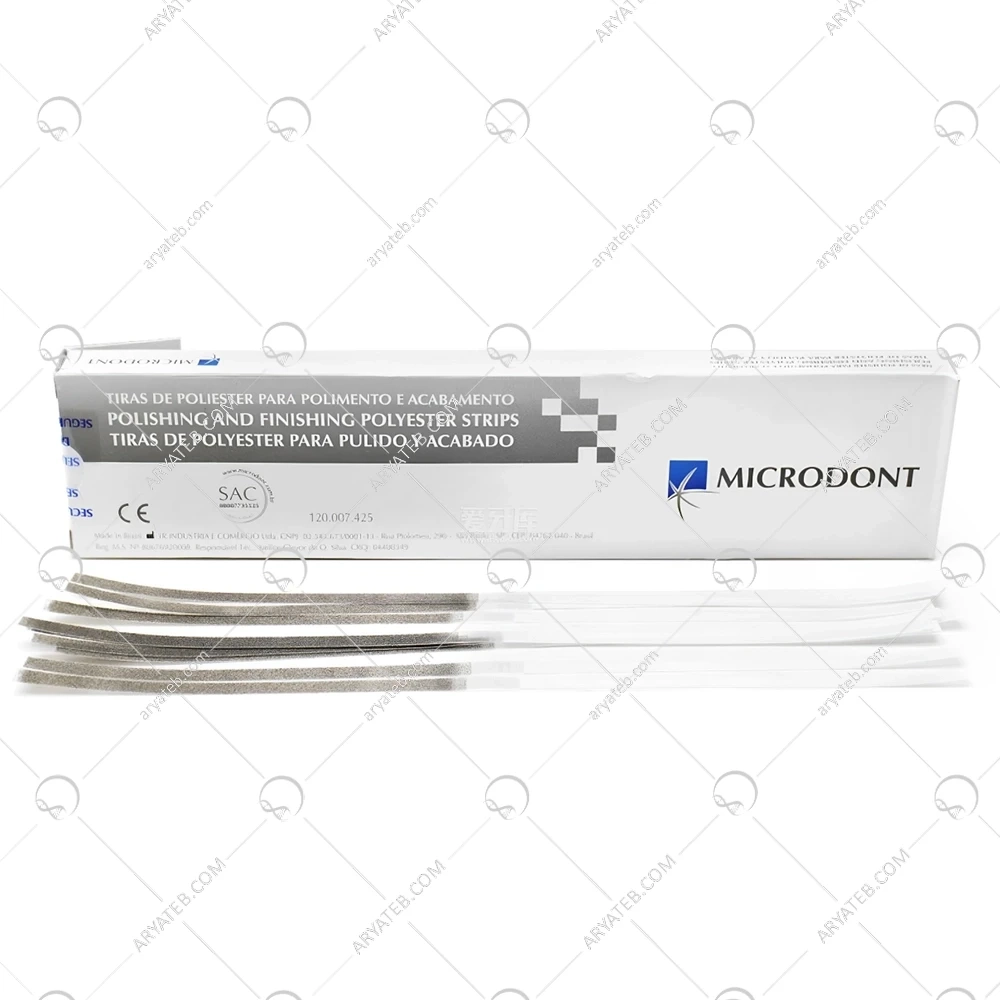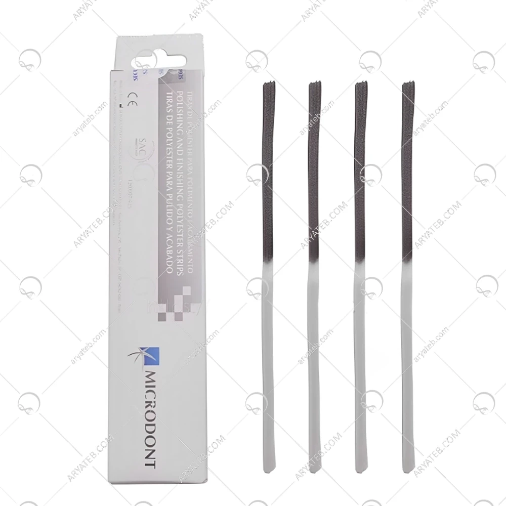 نوار پالیش Microdont در رنگهای زرد (درشت)، آبی (متوسط) و سفید (ریز) عرضه میشود تا شناسایی دانهبندی آسان باشد. جنس آن از پلیاستر شفاف یا رنگی است که انعطافپذیری و دوام را فراهم میکند. عرض نوارها معمولاً 2 تا 4 میلیمتر و طول آنها حدود 150 میلیمتر است، که برای کاربرد بیندندانی مناسب است. بافت نوارها میتواند یکطرفه یا دوطرفه ساینده باشد، بسته به نیاز پالیش.