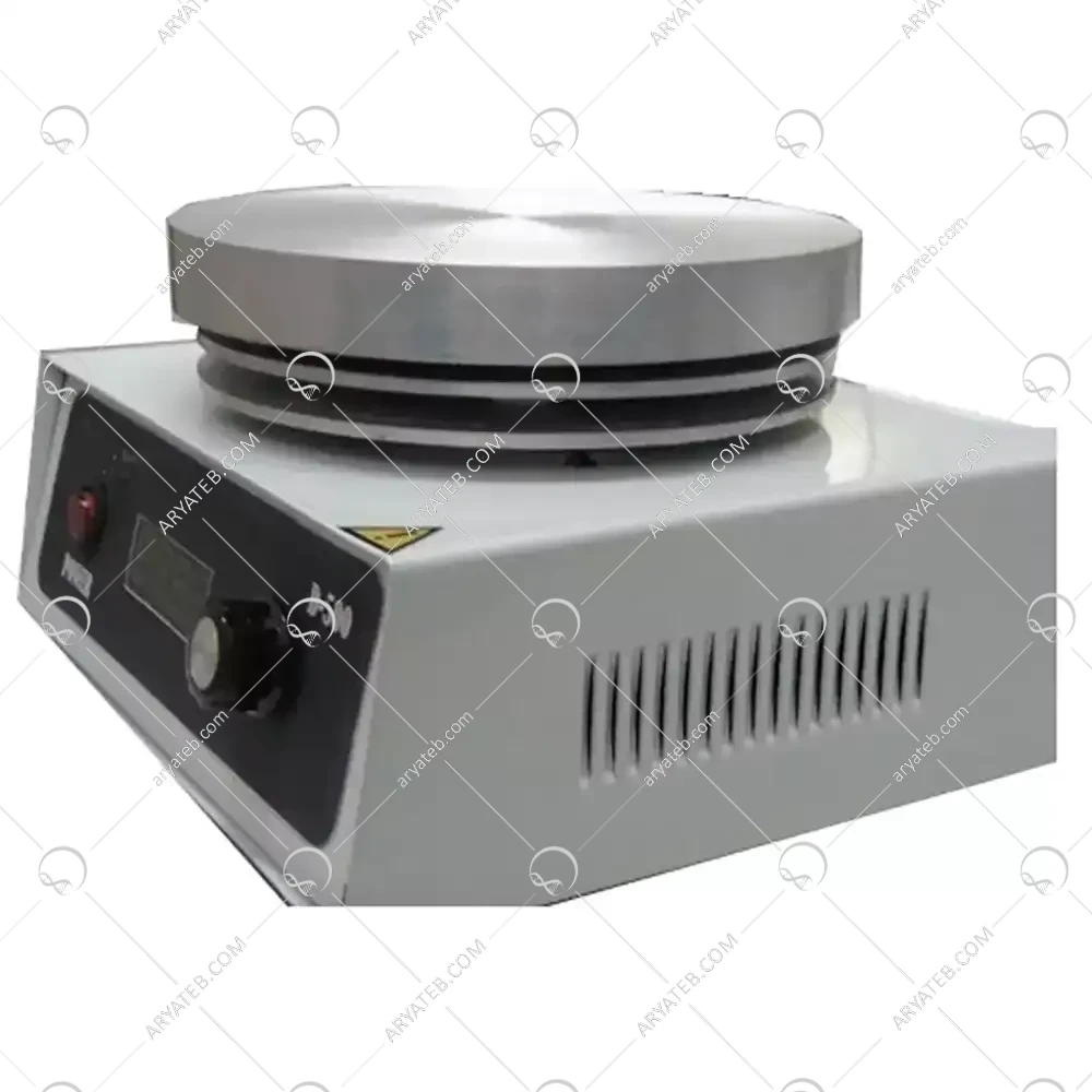 صفحه آلومینیومی: صفحه آلومینیومی به قطر 15 سانتیمتر، سطحی مناسب برای قرار دادن ظروف آزمایشگاهی فراهم میکند. آلومینیوم به دلیل هدایت حرارتی بالا، گرمای تولید شده را به طور یکنواخت به سطح منتقل کرده و از ایجاد نقاط داغ جلوگیری میکند.