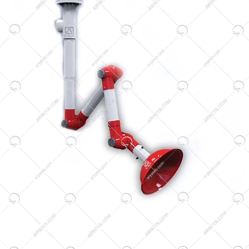 بخش بازویی (Arm): این بخش، ساختار مفصلی و قابل تنظیم هود است که امکان حرکت و تغییر موقعیت آن را در جهات مختلف و در زوایای گوناگون فراهم میکند. بازو معمولاً از چندین مفصل متحرک و لولههای مقاوم تشکیل شده است که توسط مکانیزمهای قفلشونده در موقعیت مورد نظر ثابت میشوند. انعطافپذیری بازو به کاربر اجازه میدهد تا هود را دقیقاً در نزدیکی منبع آلاینده قرار داده و از مکش موثر آلایندهها اطمینان حاصل کند. طول و قطر بازو نیز بسته به کاربرد و محدوده دسترسی مورد نیاز، متفاوت است.
