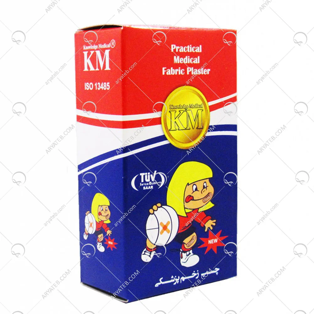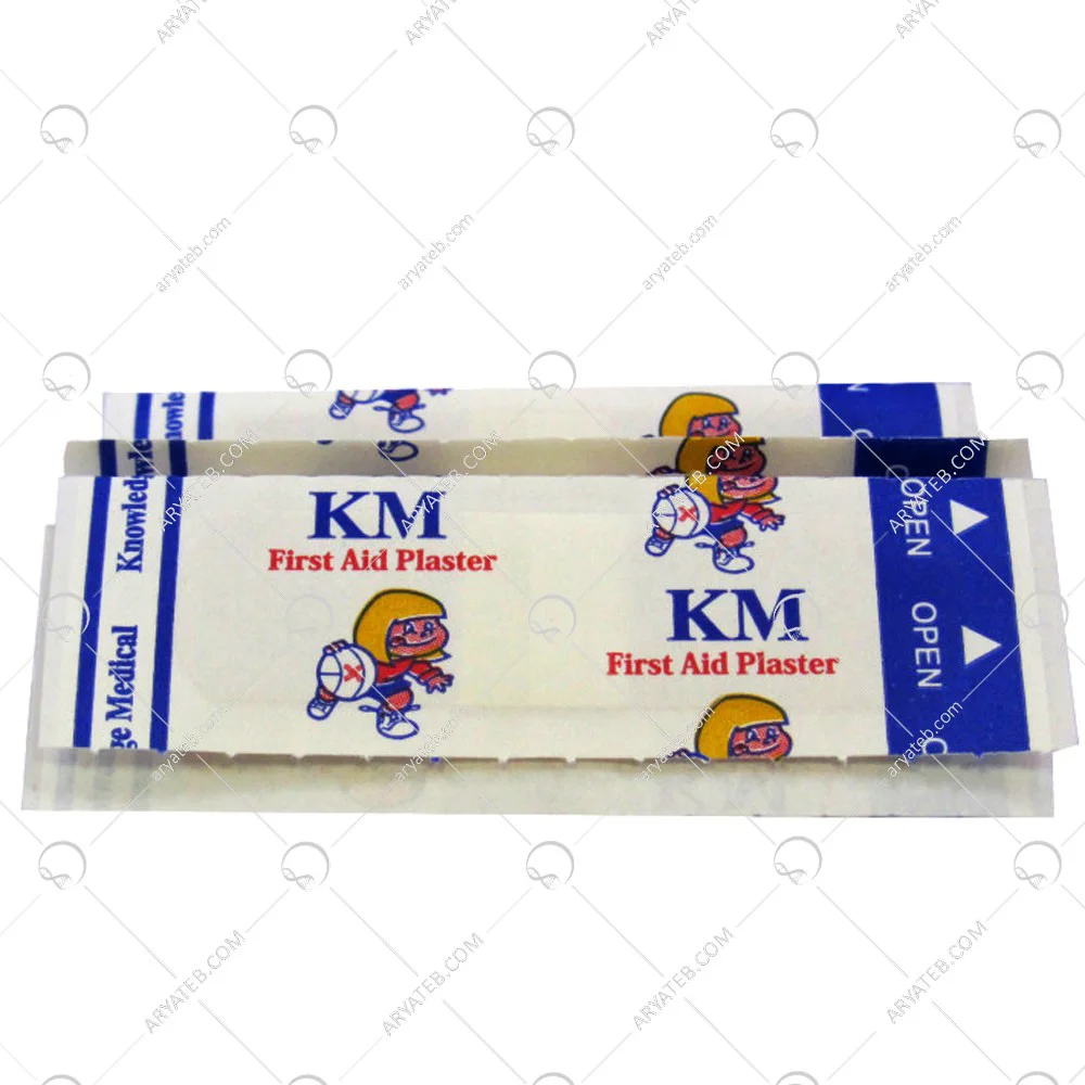 چسب زخم استریل کی ام است که برای بهبود انواع زخم های سطحی بکار می رود. این چسب که به نوعی پانسمان سریع می باشد برای جلوگیری از نفوذ و نفود انواع میکروب و الودگی به موارد استفاده از آن می شود. چسب های زخم KM در دو نوع پارچه ای و نایلونی تولید می شود که چسب زخم به صورت پارچه ای می باشد. از مزایای چسب زخم پارچه ای می توان به تهویه مناسب ب بر روی پوست اشاره کرد، باعث تسریع این چسب در 2*7 سانتی متر تولید می شود که شخص بیمار به تنهایی می تواند آنرا به محل مورد اسیب بچسباند. باید توجه کرد که چسب های پارچه ای در صورت برخورد با آب یا چسبندگی خود را از دست می دهند.