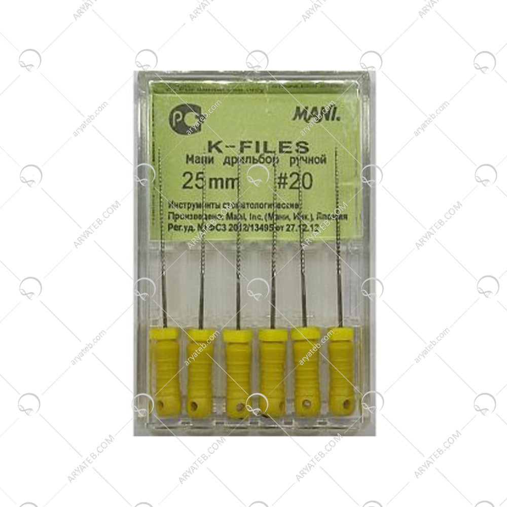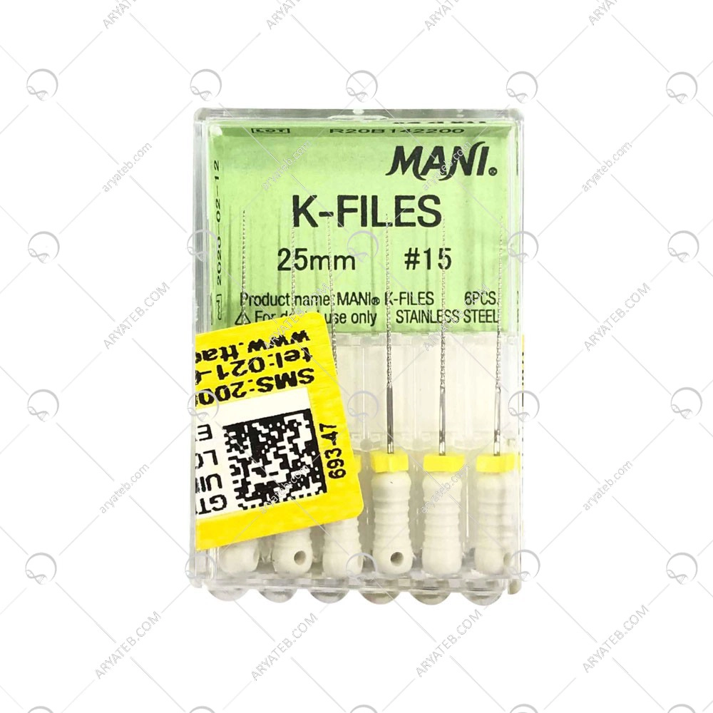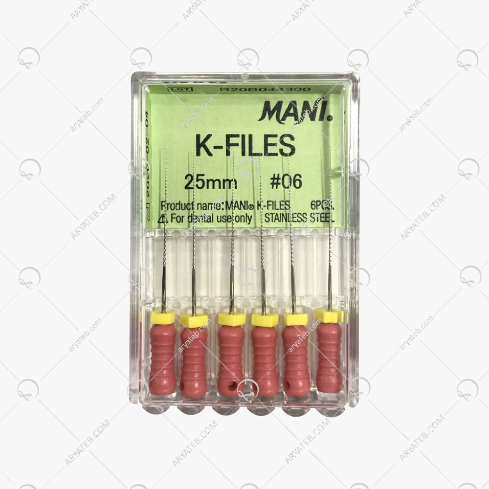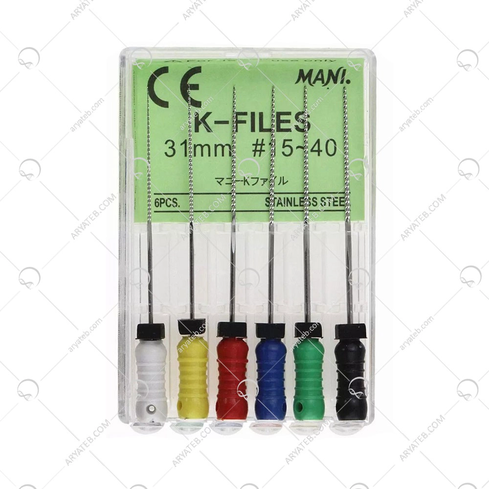 k فایل مانی نوعی ابزار ریشه هستند که برای تمیز کردن و شکل دادن به کانال ریشه در طی عملهای ریشه مورد استفاده قرار میگیرند. آنها به نام مخترع خود دکتر F. K-type نامگذاری شده اند و از فولاد ضد زنگ یا آلیاژ نیکل تیتانیوم ساخته شده اند. عملکرد اصلی k فایل مانی حذف مواد زائد و شکل دادن به دیواره های کانال در آماده سازی برای پر کردن است. آنها در اندازه های مختلف موجود هستند که اندازه فایل بر اساس قطر کانالی که باید درمان شود تعیین می شود.