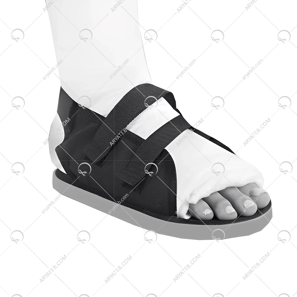 شکل و فرم کلی: این کفش دارای یک ظاهر باز و پهن است که به خوبی میتواند یک پای گچگرفته یا باندپیچی شده بزرگ و حجیم را در خود جای دهد. قسمت جلویی کفش معمولاً باز یا نیمهباز است (گاهی به صورت جعبه انگشتان)، و قسمت پشتی نیز ممکن است باز باشد یا دارای بندهای قابل تنظیم. ساختار کلی آن به جای زیبایی، بر عملکرد و محافظت تمرکز دارد. زیره کفش معمولاً صاف و پهن است و ممکن است دارای یک انحنای ملایم (rocker sole) برای تسهیل راه رفتن باشد.