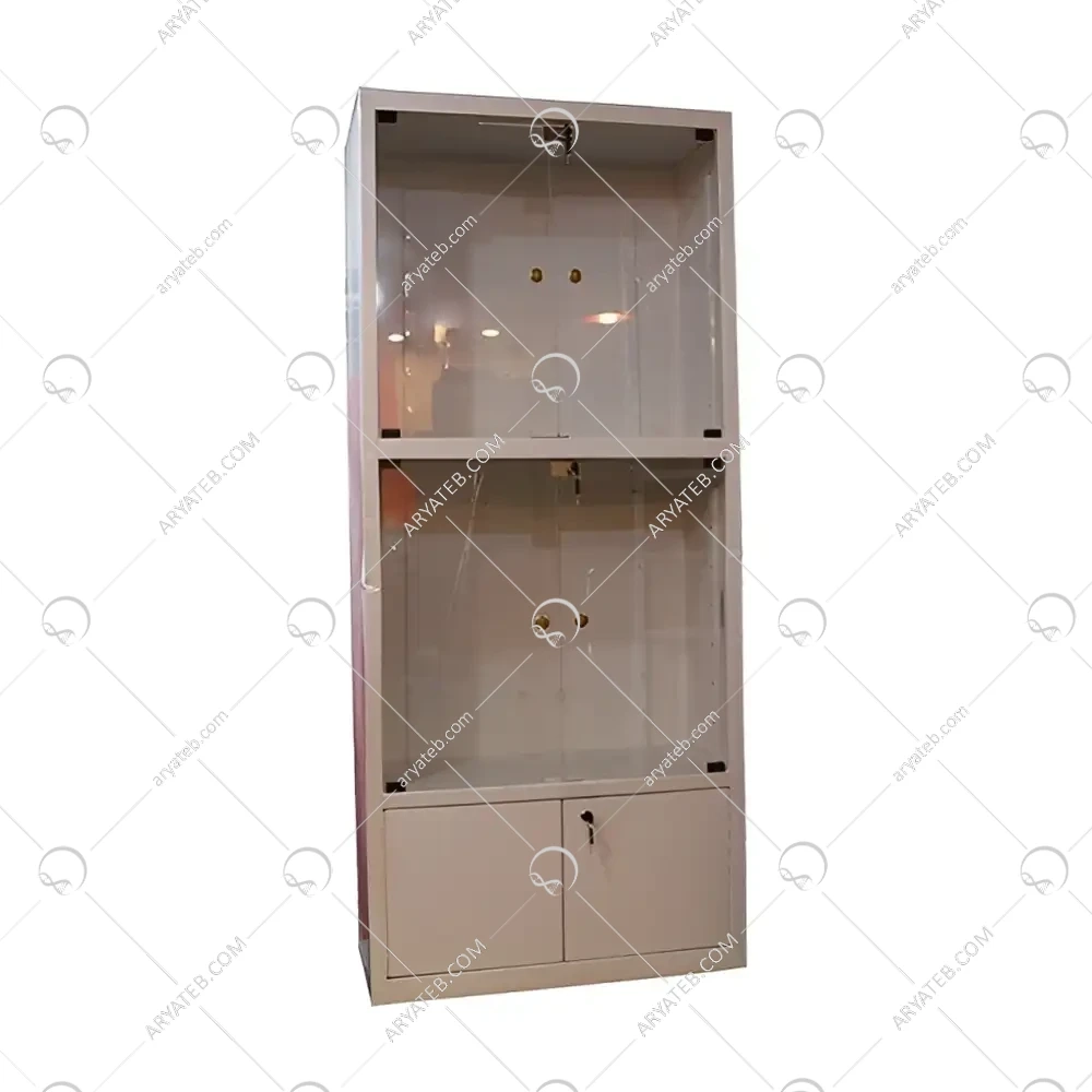 کمد با کیفیت: فولاد ضد زنگ با کیفیت بالا، شیشه سکوریت، قفسههای مقاوم، سیستم قفل امنیتی بالا.