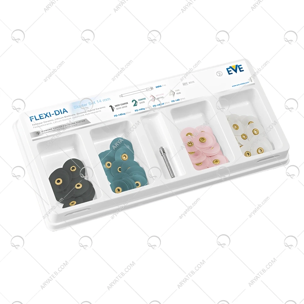 کیت دیسک پرداخت 100عددی الماسه Flexi - Dia 14 Strarter Set EVE یک ابزار بسیار مفید برای دندانپزشکان است که به آنها کمک میکند تا ترمیمهای دندانپزشکی سرامیکی را با ظاهری زیبا و ماندگار به پایان برسانند. این کیت با ترکیب ویژگیهای منحصر به فرد خود، یکی از بهترین گزینهها برای پرداخت ترمیمهای سرامیکی است.