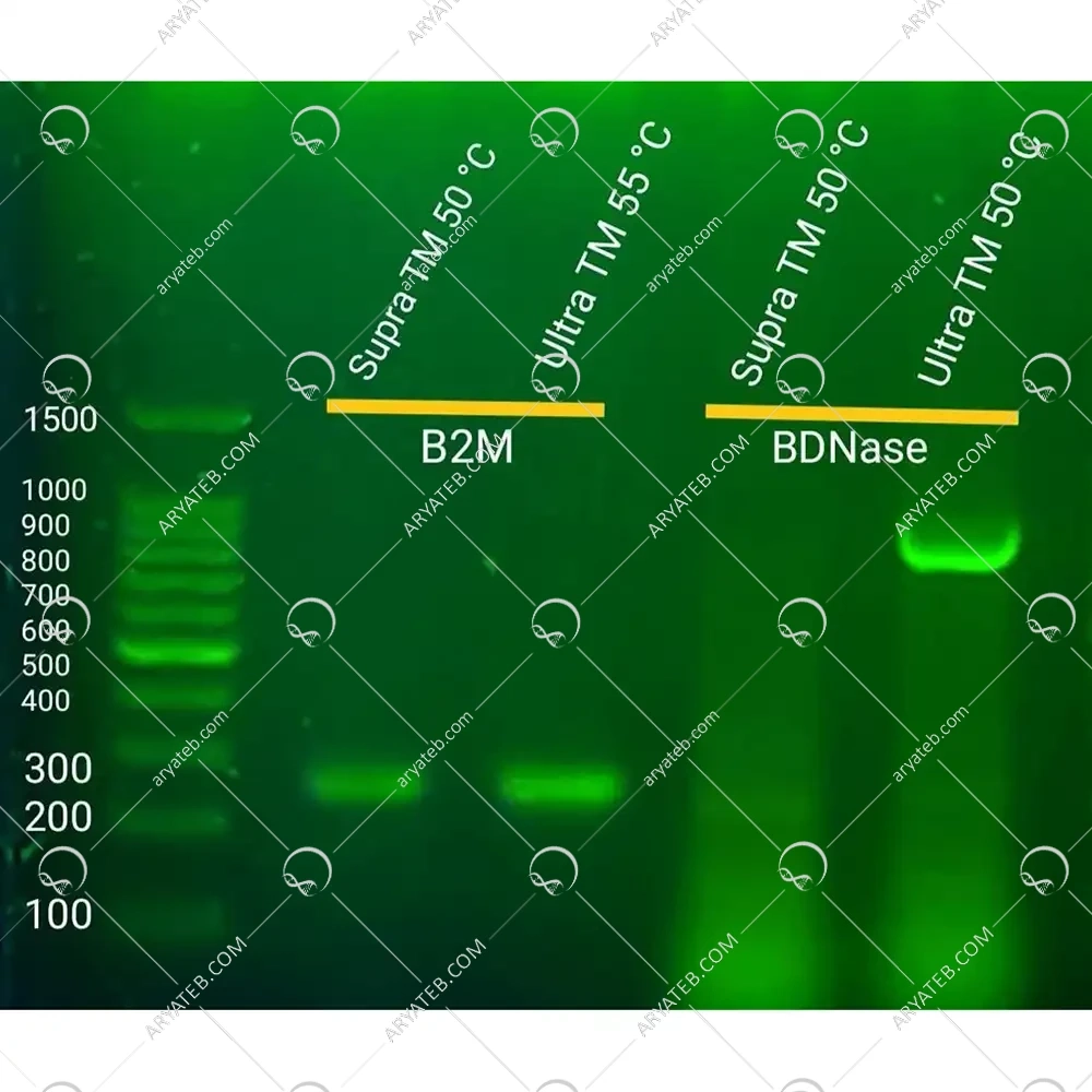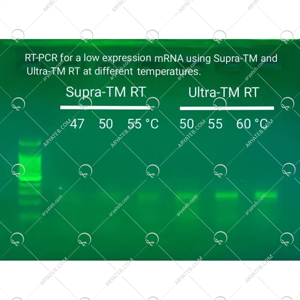 استفاده از آنزیم Ultra H-minus MMLV (مقاوم به حرارت): حضور این آنزیم قدرتمند و مقاوم به حرارت با فعالیت بهینه در 55 درجه سانتیگراد، امکان "انجام واکنش در دمای بالا" را فراهم میکند. این دما به طور موثر "ساختارهای ثانویه RNA" را ناپایدار کرده و رونویسی کارآمد و کامل را حتی از RNAهای پیچیده و ژنهای با بیان کم تسهیل میکند.