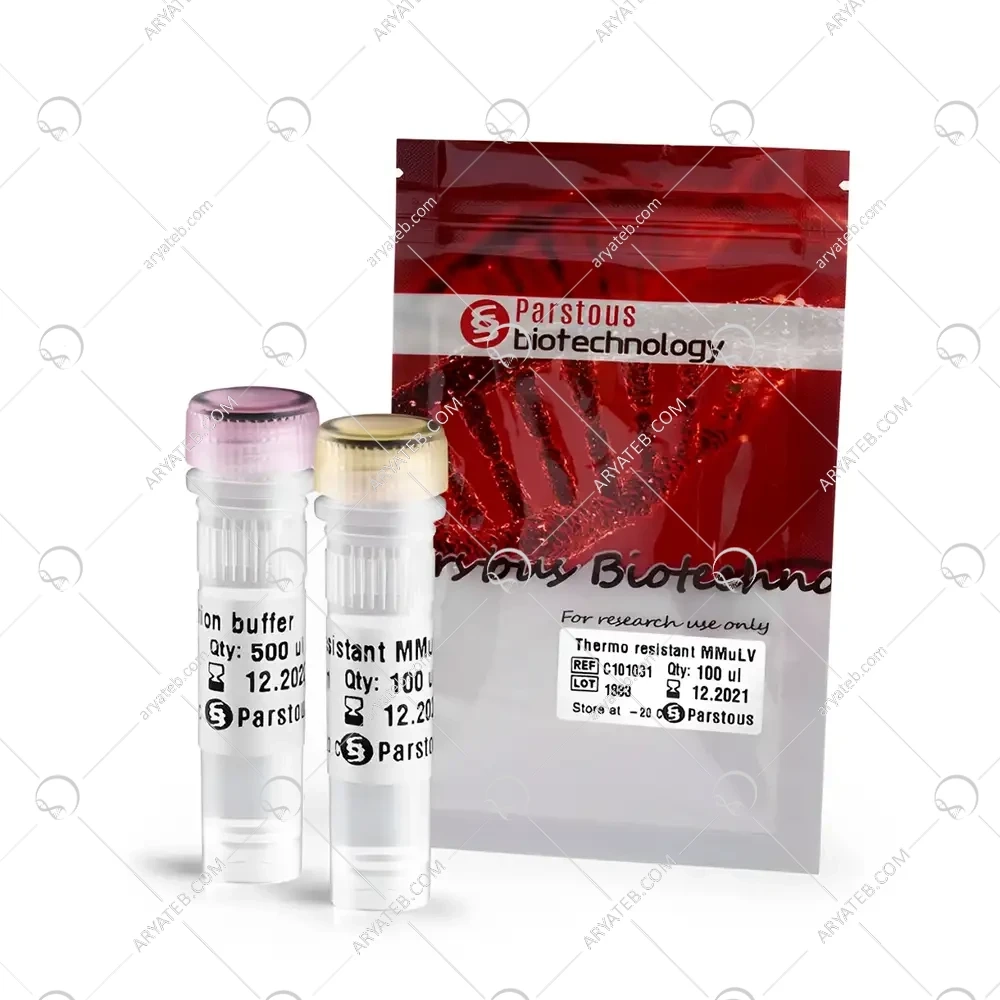 - Easy cDNA Ultra-TM Synthesis Kit دارای تمام اجزای لازم برای تبدیل RNA کل یا mRNA به cDNA تک رشته ای می باشد. از مزایای مهم کیت سنتز cDNA اولترا پارس توس استفاده از آنزیم H-minus MMLV اولترا مقاوم در برابر حرارت با فعالیت بهینه در دمای 55 درجه سانتی گراد در مخلوط آنزیمی است که انجام واکنش در دمای بالا و زمان کمتر را فراهم می کند. این محصول برای ژنهای با بیان کم بسیار مناسب می باشد.