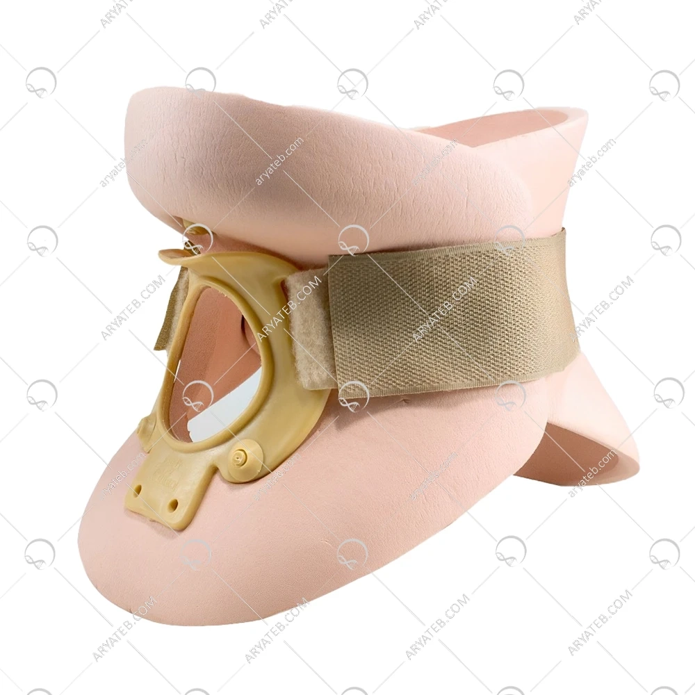1-فاصله بین لبه جناغ سینه و فک پایین را در حالیکه گردن در وضعیت اکستنشن اندازه بگیرید. اگر اندازه بیمار بین دو اندازه متوالی قرار می گیرد، ابتدا اندازه بزرگتر را امتحان کنید. پس از انتخاب سایز مناسب گردنبند، آنرا را دور گردن بیمار مطابق شکل ببندید. چانه ی بیمار باید روی محل قرارگیری آن بر روی گردنبند قرار گرفته باشد. قبل از اتصال بندهای چسبی، مطمئن شوید که سر و گردنبند بیمار در حالت خنثی قرار دارند. اگر بیمار در وضعیت خوابیده به پشت است، قسمت پشت گردنبند را پشت گردن بیمار بلغزانید تا بند چسبی دیده شود.