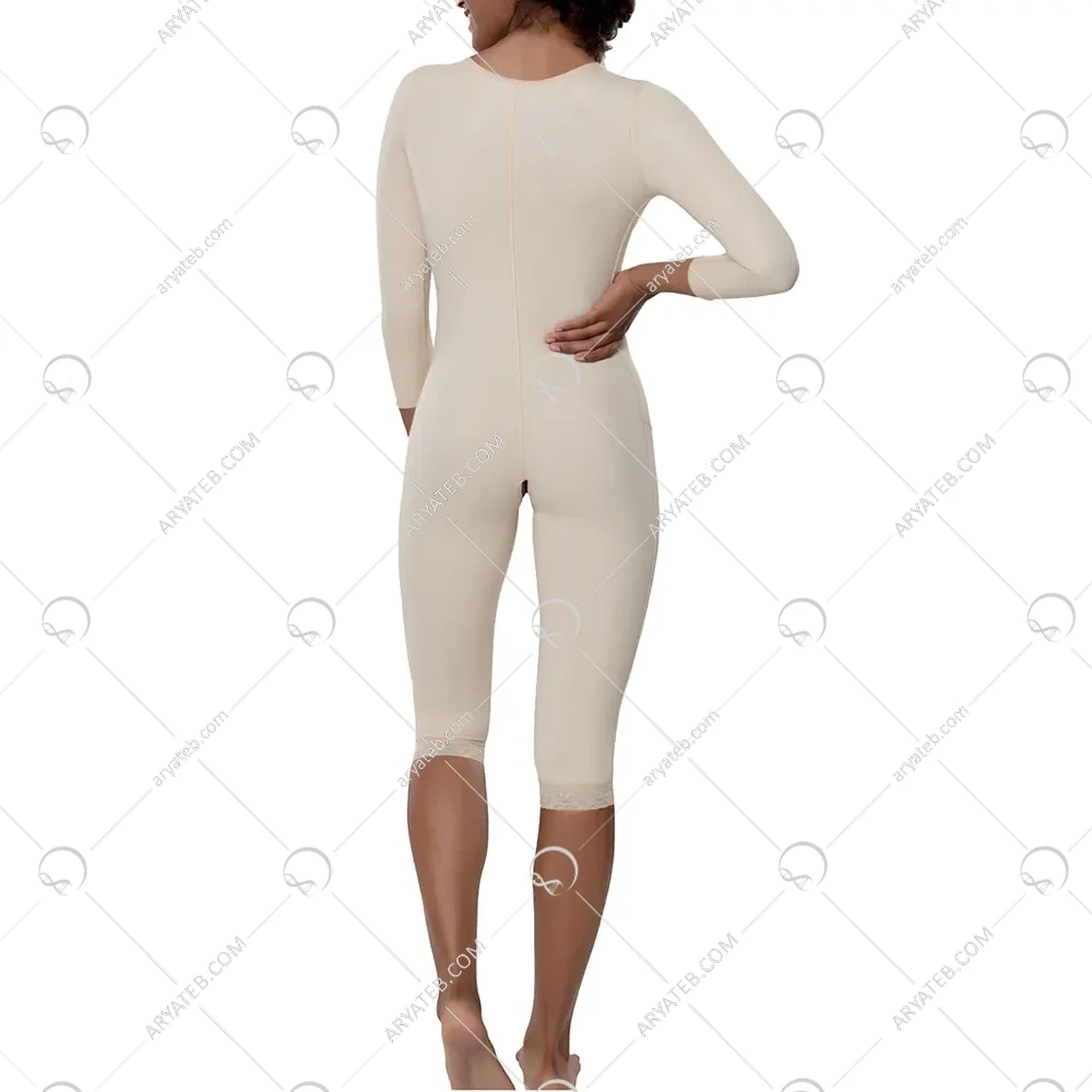 - پوشش کامل: بارزترین ویژگی، پوشش گسترده آن از بازوها (آستیندار)، ناحیه تنه (شکم، پهلوها، پشت)، باسن و رانها، تا ساق پا است. این طراحی به آن ظاهری شبیه به یک لباس سرهمی (Body Suit) با پاچههای بلند و آستینهای بلند میدهد.